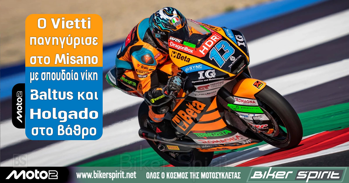 Ο Celestino Vietti πανηγύρισε μια σπουδαία νίκη μπροστά στο ιταλικό κοινό στο Misano, στον αγώνα της κατηγορίας Moto2, που είχε ένταση, ανατροπές και δυνατές μάχες μέχρι τον τελευταίο γύρο.