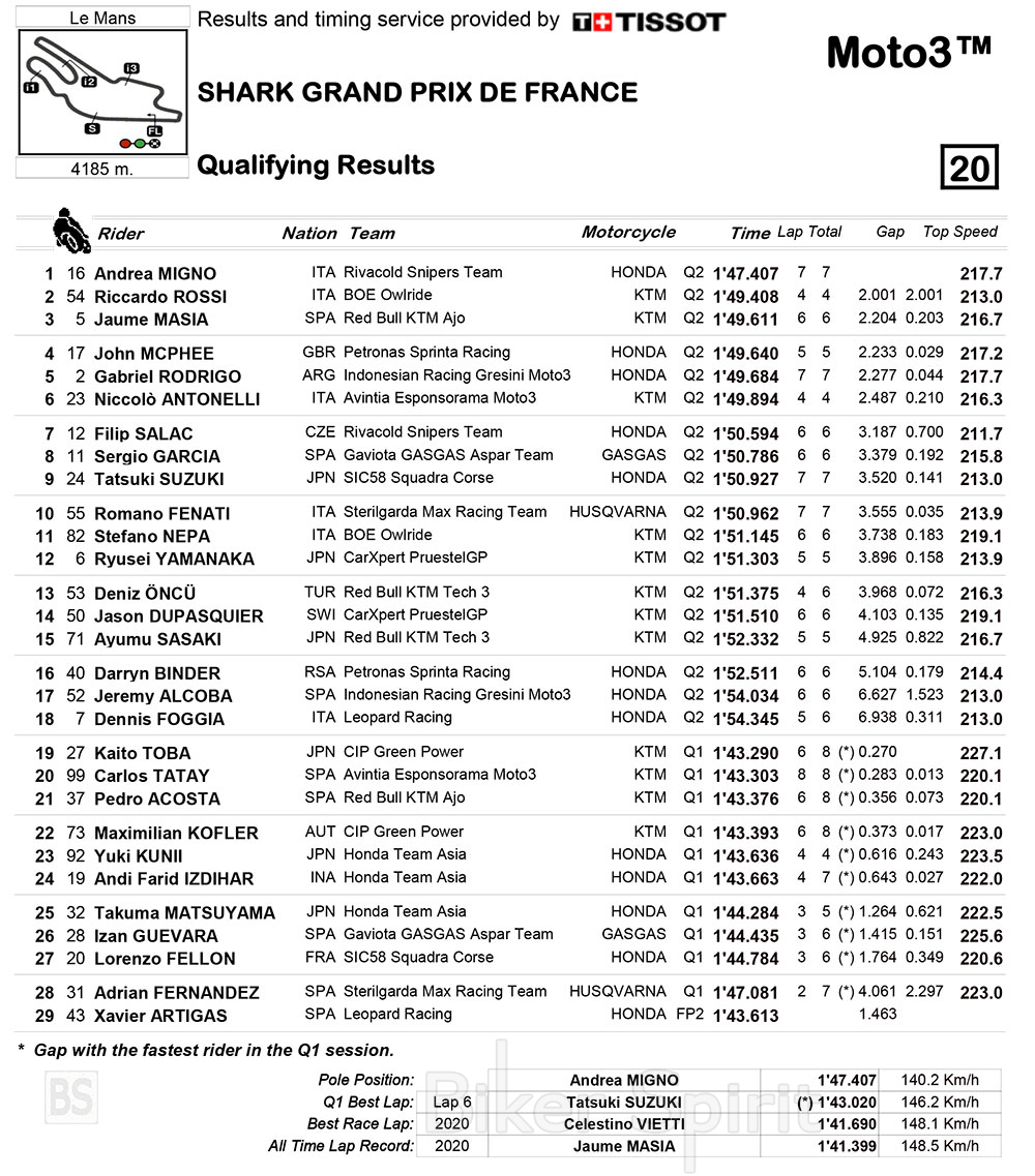 Από την τρίτη σειρά και την 7η θέση θα εκκινήσει ο Filip Salac (Snipers), μπροστά από τους Sergio Garcia και Tatsuki Suzuki (SIC58 Squadra Corse). Ο Romano Fenati (Max Racing Team) ολοκληρώνει τους δέκα πρώτους.
