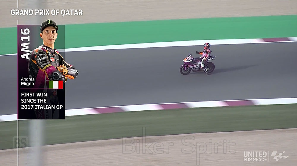 Ο αγώνας κρίθηκε σχεδόν με την καρό σημαία με τον οδηγό της Team Snipers να κερδίζει σε ένα σπριντ τον Sergio Garcia (GASGAS) και τον Kaito Toba (CIP). Αυτή ήταν η δεύτερη νίκη της καριέρας του για τον Ιταλό, μετά το Mugello 2017. Ένας ο πρώτο Ιταλός που κερδίζει στην πίστα Losail από το 2016, με τον Niccolò Antonelli.
