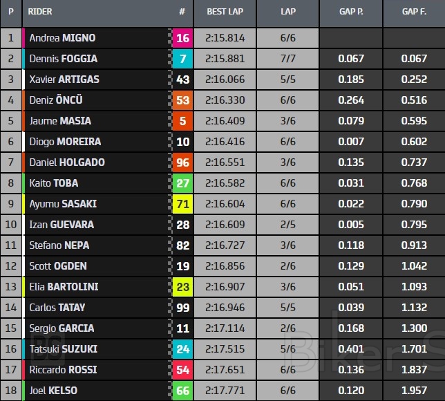 Στην 2η θέση στην πρώτη σειρά θα ξεκινήσει ο Dennis Foggia (Leopard) που τερμάτισε μόλις 67 χιλιοστά από τον καλύτερο γύρο, ενώ την τριάδα κλείνει ο Xavier Artigas (CFMOTO PruestelGP).