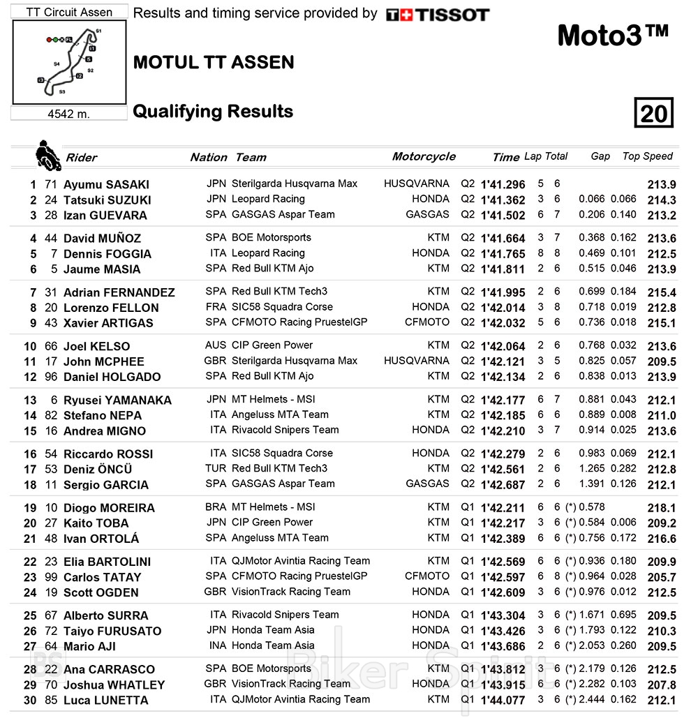 Στην δεύτερη θέση με μόλις κατά 66 χιλιοστά διαφορά ο οδηγός της Honda Leopard Team, Tatsuki Suzuki, ο οποίος έπεσε στο τέλος της συνεδρίας. Ο Izan Guevara, νικητής στο Sachsenring, θα ξεκινήσει επίσης στην πρώτη σειρά με το GasGas της Team Aspar, από την 3η θέση.