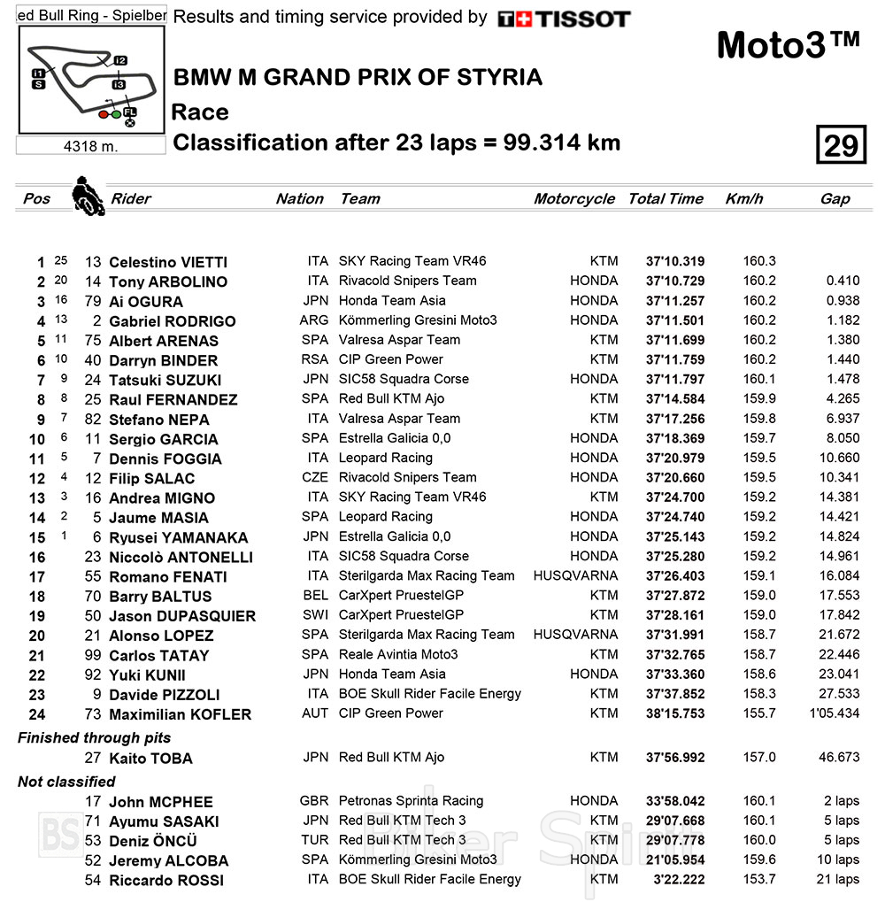 Ο Tatsuki Suzuki (SIC58 Squadra Corse) πέρασε τη γραμμή τερματισμού στην έβδομη θέση, μπροστά από τον Raul Fernandez και τον Stefano Nepa (Aspar). Ο Gabriel Garcia ολοκλήρωσε την πρώτη δεκάδα!