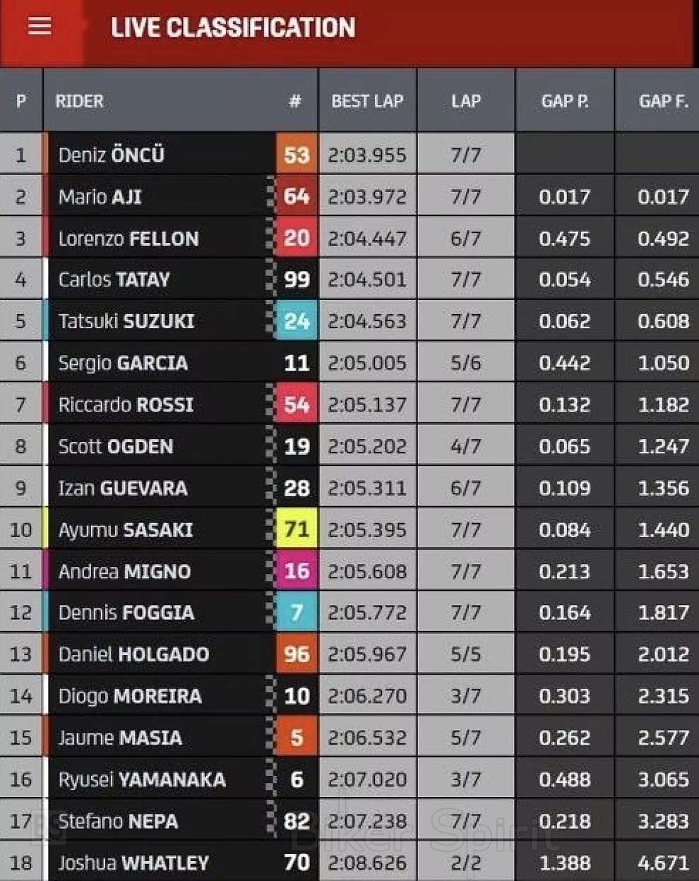 Στην δεύτερη θέση θα είναι ο Mario Aji (Honda Team Asia), ενώ την πρώτη σειρά θα κλείσει στην τρίτη θέση ο Lorenzo Fellon (SIC58 Squadra Corse).