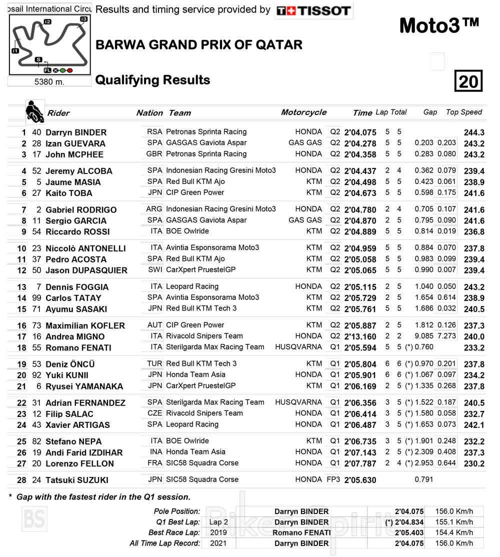 Ο Νοτιοαφρικανός, Darryn Binder, αναβάτης της Petronas Sprinta Racing με φοβερή απόδοση πέρασε από το Q1 και κερδίσει την πρώτη pole position του 2021 στο Grand Prix του Κατάρ, σταματώντας το χρονόμετρο στο 2:04.075, κάνοντας ένα νέο ρεκόρ γύρου.