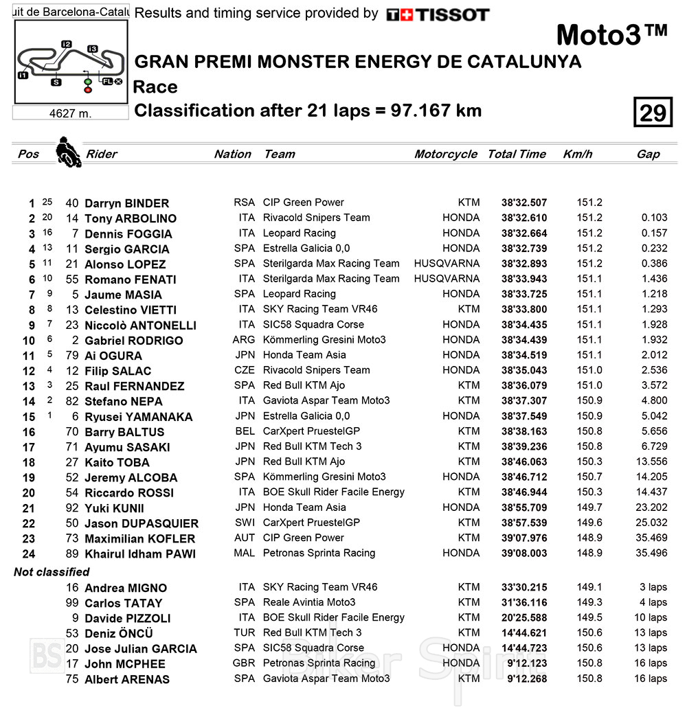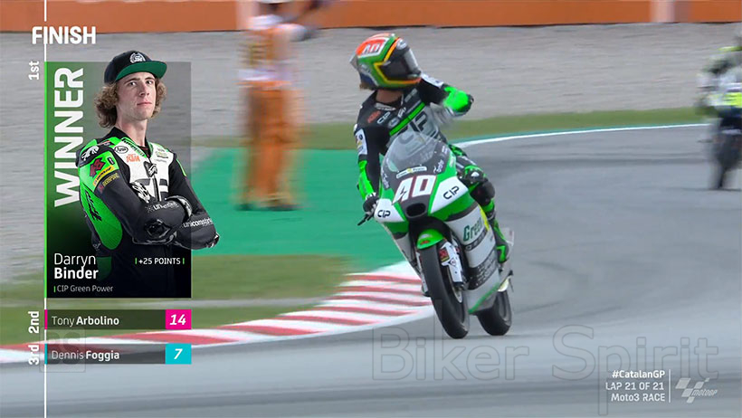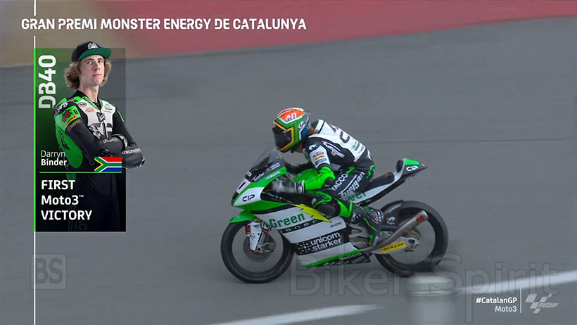 Ο αναβάτης της ομάδας CIP, Darryn Binder, αδελφός του Brand Binder που αγωνίζεται στην μεγάλη κατηγορία MotoGP με την ΚΤΜ, κέρδισε την πρώτη νίκη της καριέρας του στον αγώνα της Catalunya