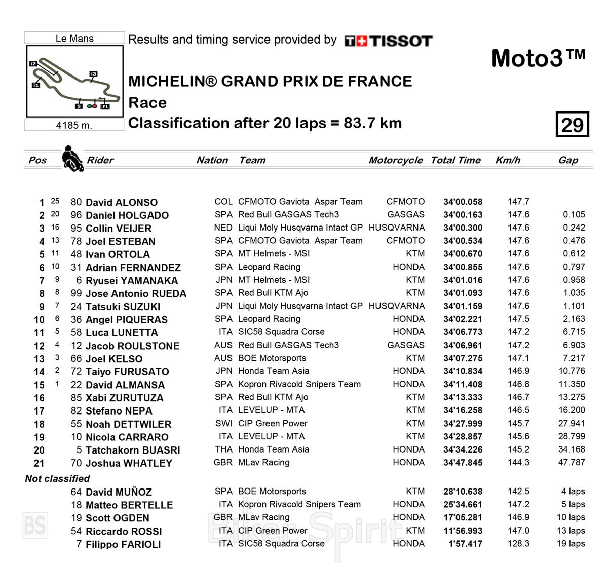 Στο Top Ten τερμάτισαν επίσης οι Josè Antonio Rueda (KTM Red Bull KTM Ajo), Tatsuki Suzuki (Husqvarna Intact GP) και Angel Piqueras (Honda Leopard).