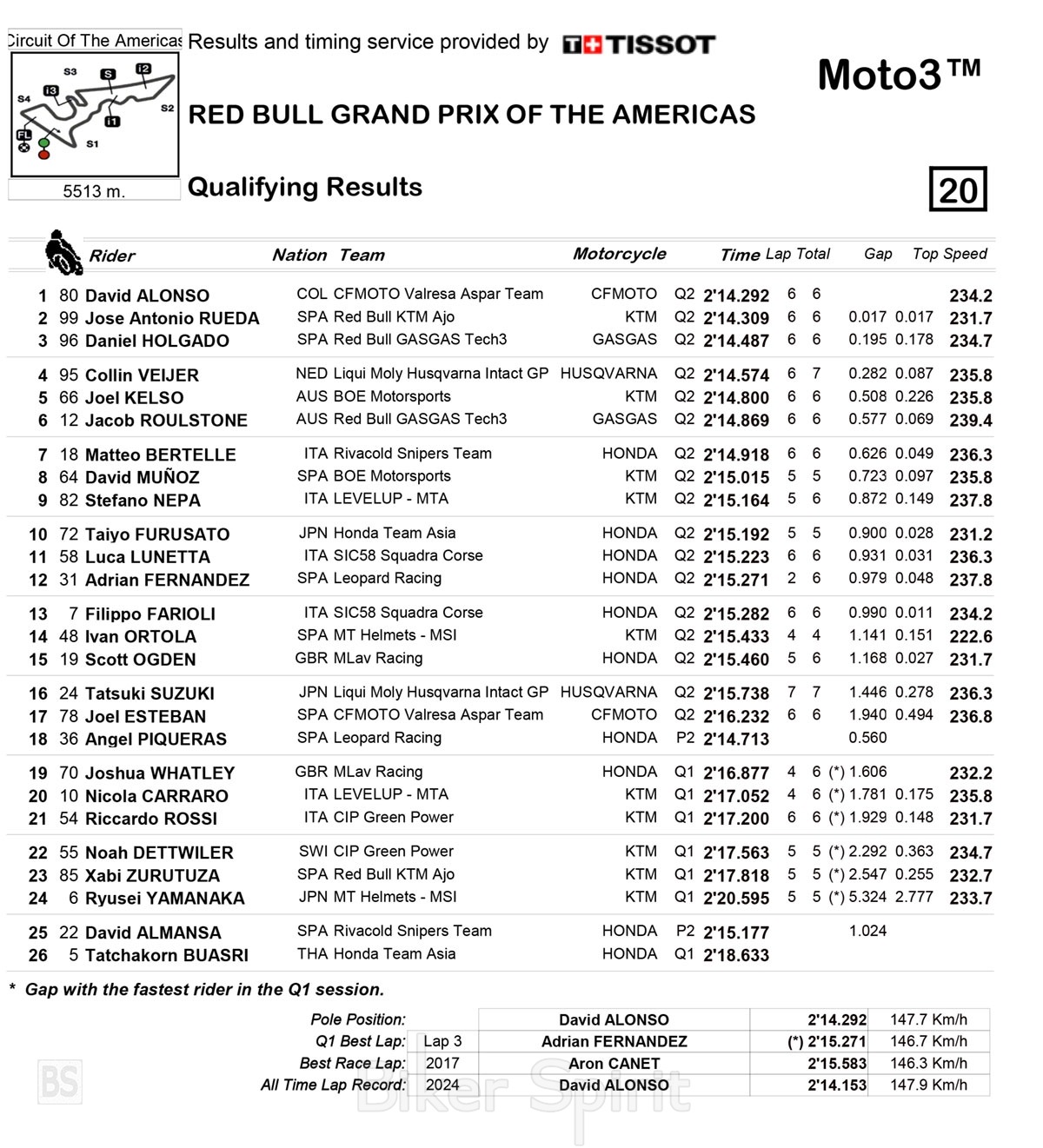 Ο #80, που έκανε χρόνο 2:14.292, ήταν μόλις 17 χιλιοστά μπροστά από τον Jose Antonio Rueda με την Red Bull Ajo Team KTM και 0,195 δευτερόλεπτα μπροστά από τον Daniel Holgado με την Tech3 Team GASGAS που κλείνουν την πρώτη σειρά εκκίνησης. Η pole του Alonso είναι επίσης η πρώτη από Κολομβιανό οδηγός σε GP.