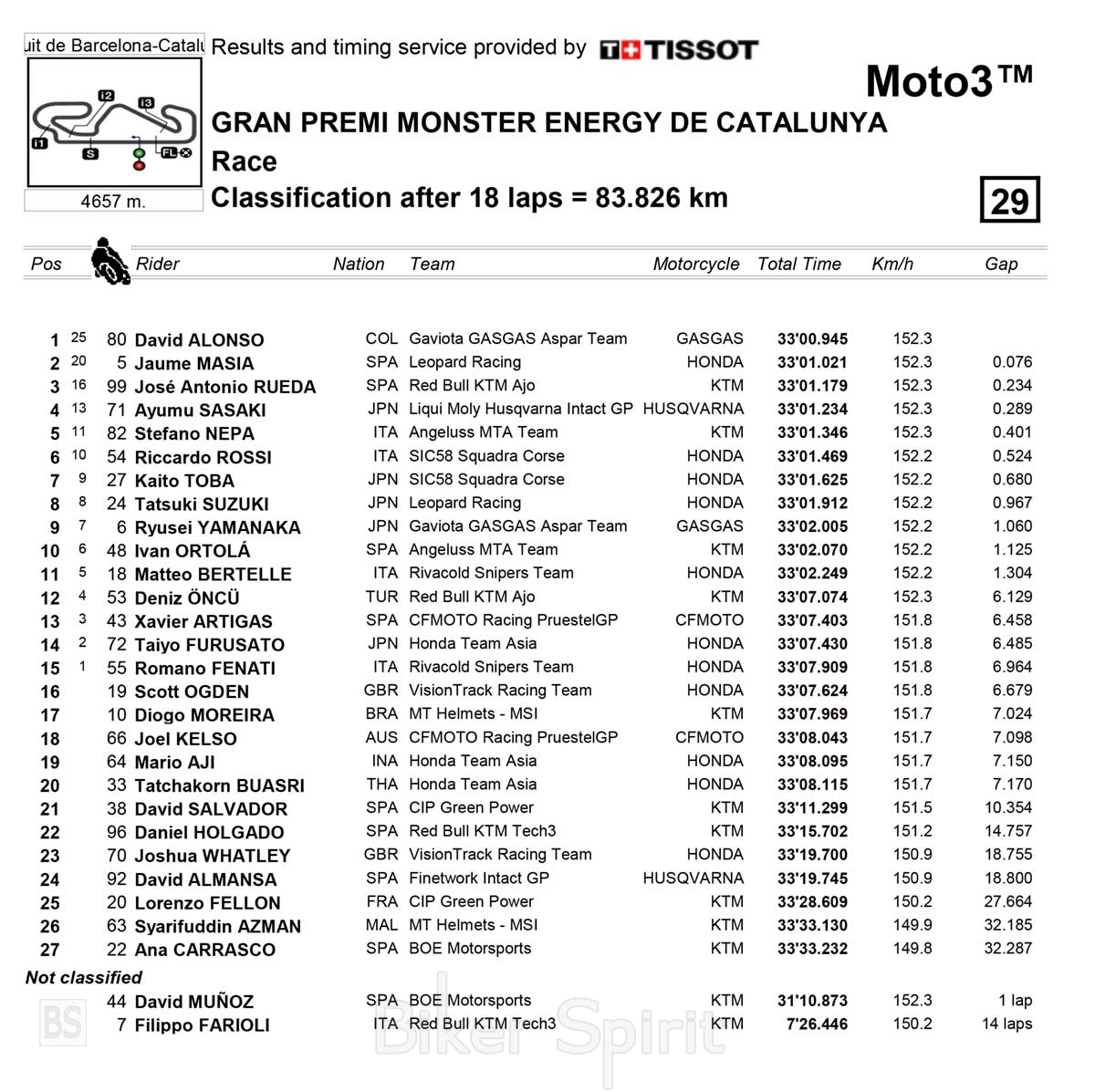 Στο βάθρο ανέβηκε και ο Jaume Masia με την Honda Leopard και ο πρωτάρης Josè Antonio Rueda (KTM Red Bull Ajo), με τον τελευταίο να περνά τη γραμμή τερματισμού στην τέταρτη θέση, αλλά ο οποίος στη συνέχεια επωφελήθηκε από την ποινή που επιβλήθηκε στον Deniz Oncu (KTM Red Bull Ajo) που στην τελευταία στροφή άγγιξε και έριξε τον David Munoz (KTM BOE), λαμβάνοντας ποινή έξι δευτερολέπτων, που ισοδυναμεί με διπλή ποινή μεγάλου γύρου.