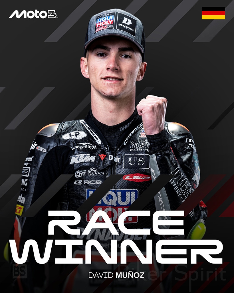 Ο David Muñoz πανηγύρισε μια συγκλονιστική νίκη στο Grand Prix Γερμανίας, κατακτώντας την πρώτη θέση στον αγώνα Moto3 και χαρίζοντας στην ομάδα του Liqui Moly Dynavolt Intact GP τον απόλυτο θρίαμβο μέσα στην έδρα της.