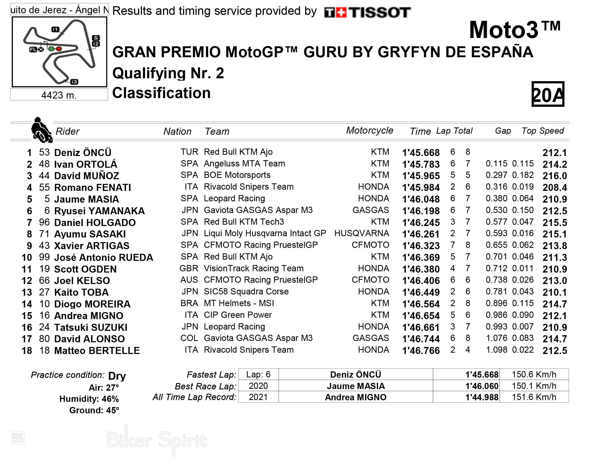 Ο αναβάτης της ομάδας KTM Ajo σταμάτησε το χρονόμετρο στο 1:45.668 μπροστά από τον Ivan Ortolà (MTA) και τον Davd Munoz (BOE), που είχε μια άσχημη πτώση στην τελική συνεδρία και απομακρύνθηκε με φορείο.