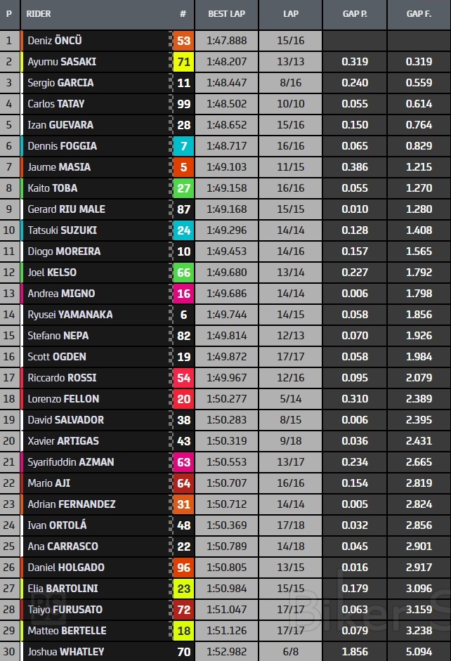 Την πρώτη δεκάδα έκλεισαν οι Ten Kaito Toba (KTM CIP), Gerard Riu Male (KTM BOE) και Tatsuki Suzuki (Honda Leopard).