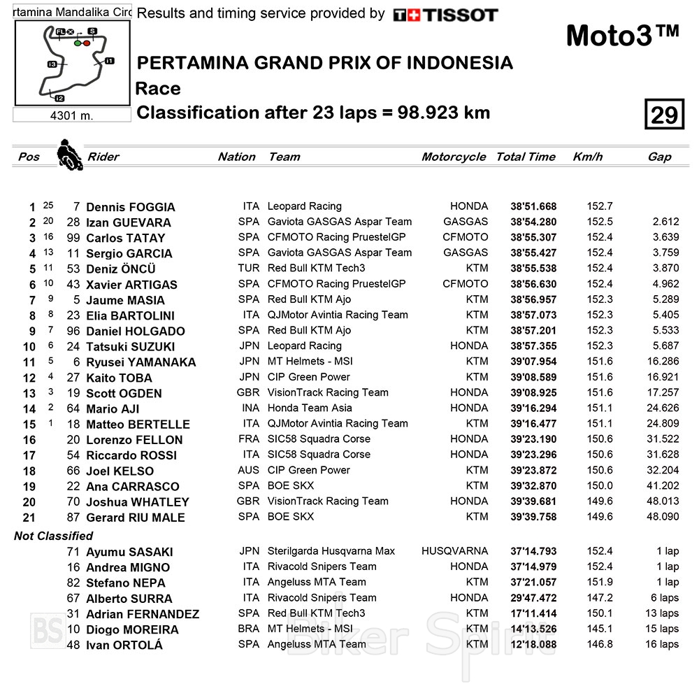 Όγδοος ο Elia Bartolini (KTM Avintia), που τερμάτισε μπροστά από τον Daniel Holgado (KTM Red Bull Ajo) και τον Tatsuki Suzuki (Honda Leopard), που έκλεισε το Top Ten.