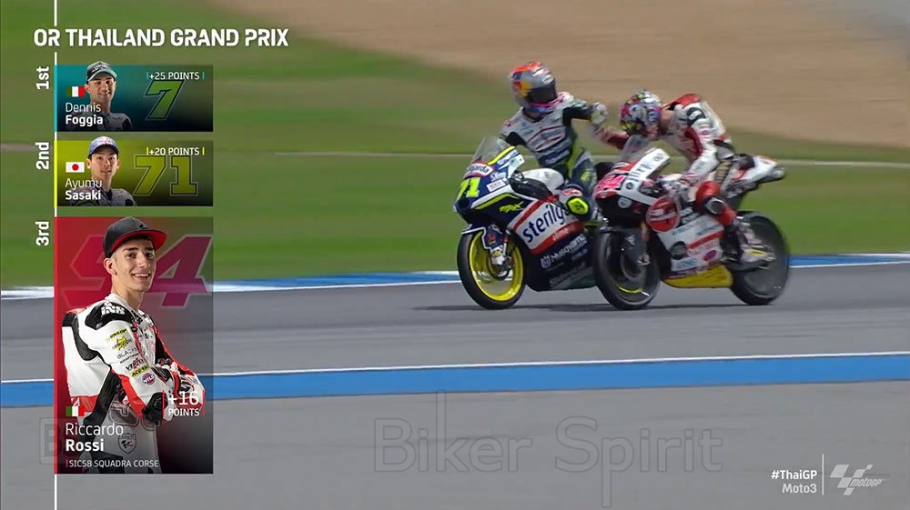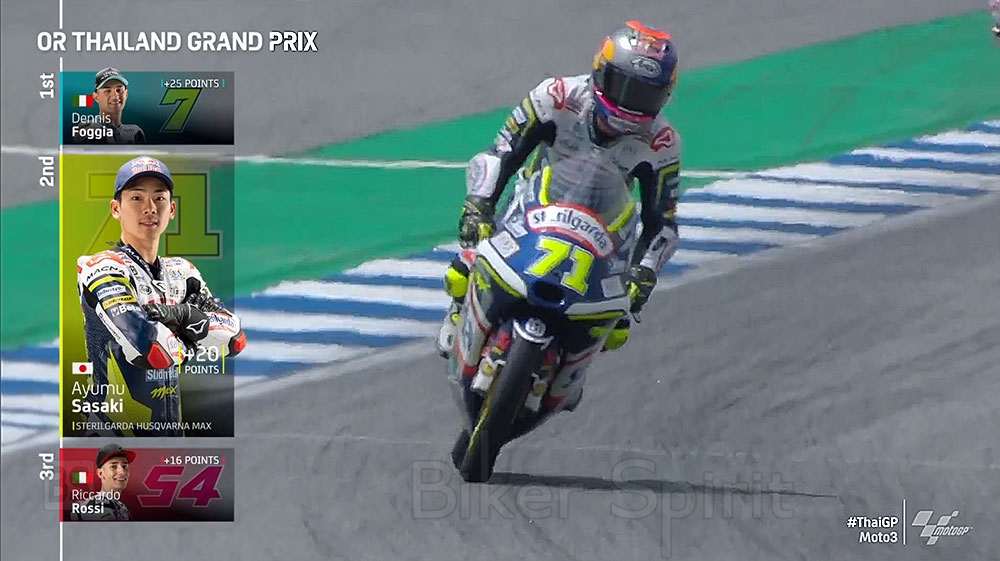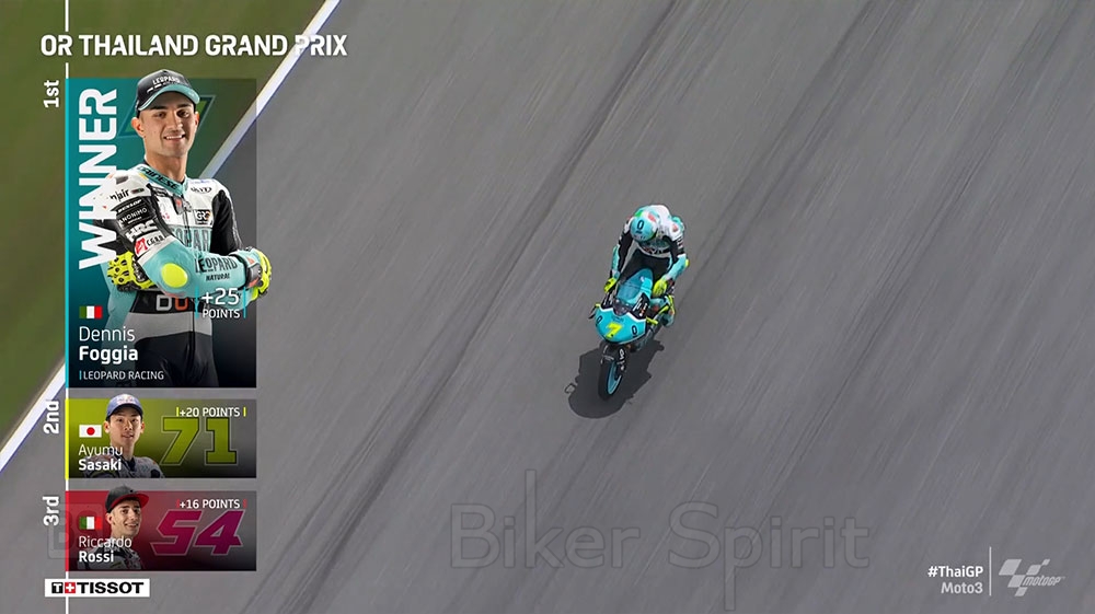 Ο αναβάτης της Honda Leopard Team διατήρησε το προβάδισμα του αγώνα, χάνοντας το μόνο σε μία στροφή, περνώντας τη γραμμή τερματισμού μπροστά από τους Ayumu Sasaki (Husqvarna Max Racing Team) και Riccardo Rossi, που έκλεισαν το βάθρο στην Ταϊλάνδη!