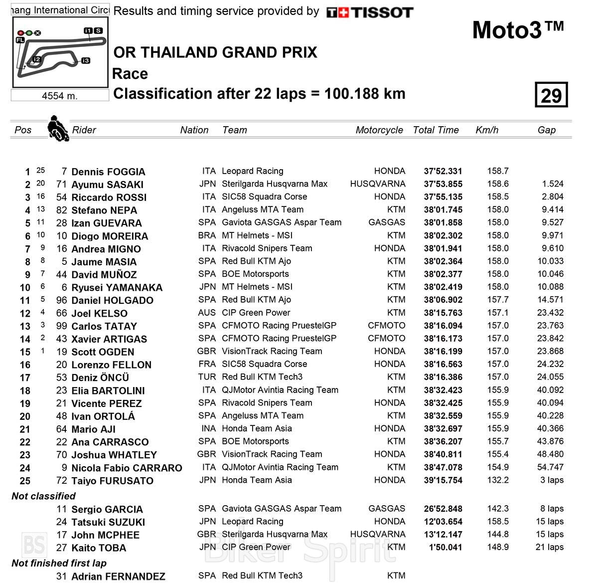 Για τον Dennis Foggia αυτή είναι η τέταρτη νίκη της σεζόν μετά από αυτές των Ινδονησίας, του Σίλβερστοουν και του Μισάνο και είναι πλέον δεύτερος στο Παγκόσμιο Πρωτάθλημα με 49 βαθμούς πίσω από τον ηγέτη Izan Guevara (GasGas Aspar), που τερμάτισε πέμπτος σήμερα μετά από μια καλή επιστροφή.
