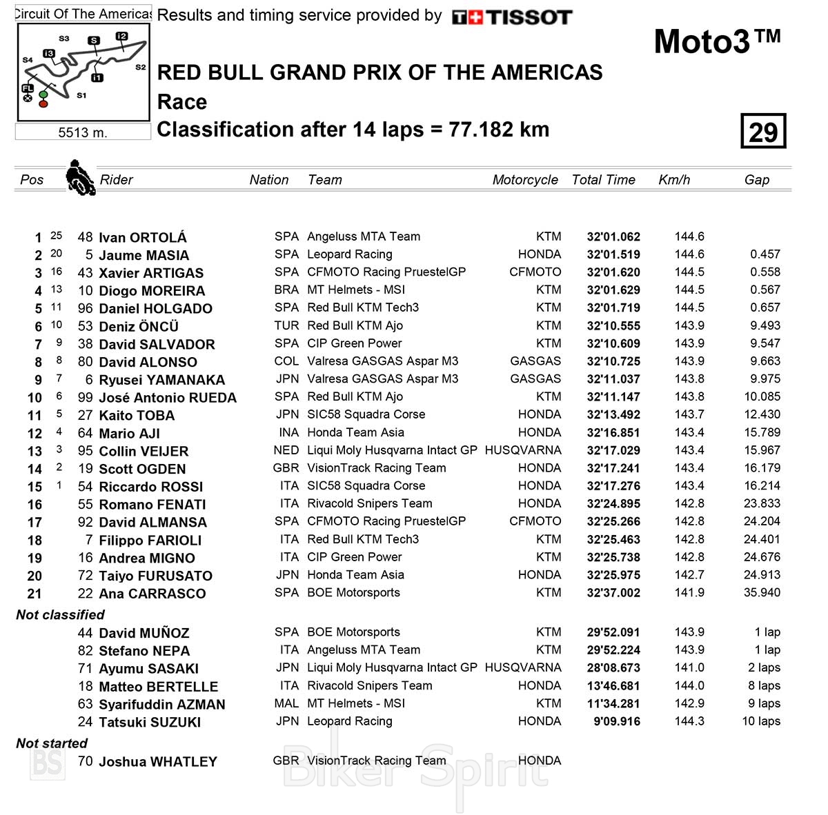 Ο Ortolà πέρασε τη γραμμή του τερματισμού με το προβάδισμα πρώτος για να πάρει την πρώτη νίκη της καριέρας του, όχι μόνο στο Παγκόσμιο Πρωτάθλημα αλλά και στις άλλες κατηγορίες. Μεγάλη χαρά για τον αναβάτη της Βαλένθια, συγγραφέα μιας απίστευτης επιστροφής σε μόλις δύο γύρους.