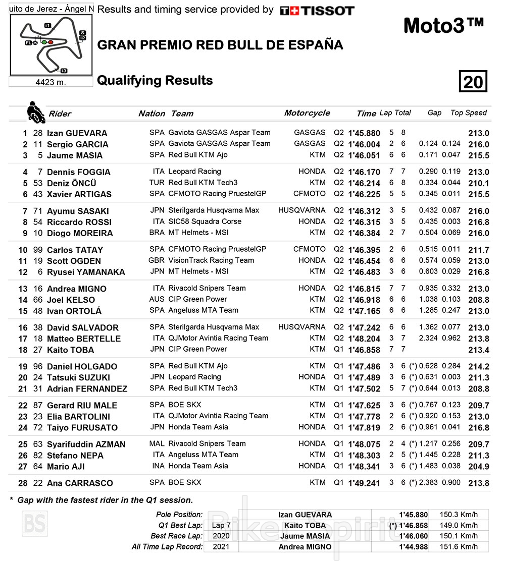Ο οδηγός της ομάδας GasGas σταμάτησε το χρονόμετρο στο 1: 45.880 κατακτώντας έτσι την δεύτερη pole position της καριέρας του και την πρώτη αυτή τη σεζόν. Πίσω από τον Ισπανό, ο ομόστυαλός του Sergio Garcia (πρωτοπόρος της παγκόσμιας κατάταξης) και ο Jaume Masia (KTM Ajo) που κλείνει την πρώτη σειρά εκκίνησης.