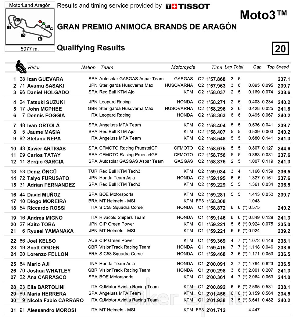 Στην πρώτη σειρά από την δεύτερη θέση θα εκκινήσει ο Ιάπωνας της Max Racing Team, Ayumu Sasaki, μπροστά από τον rookie Daniel Holgado (KTM Red Bull Ajo) που κλείνει την πρώτη σειρά.