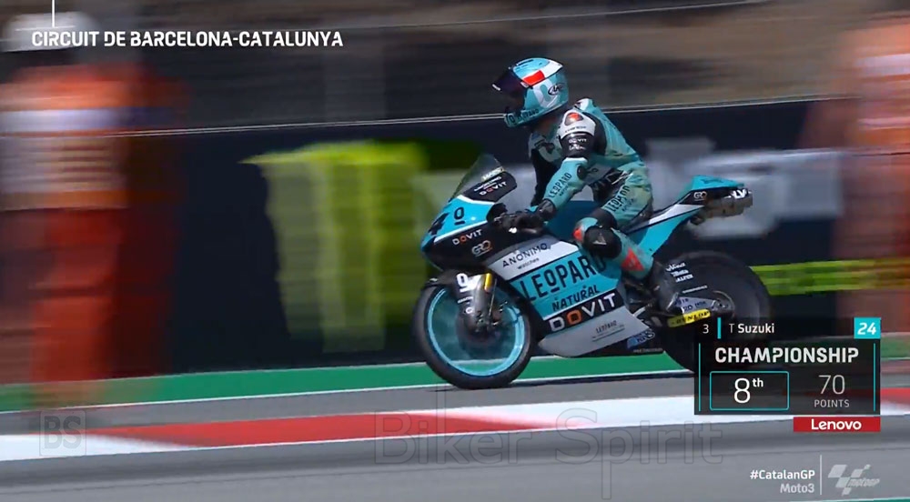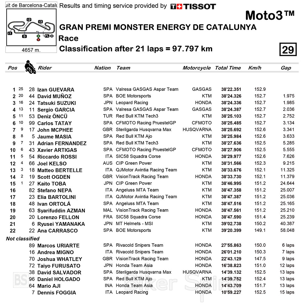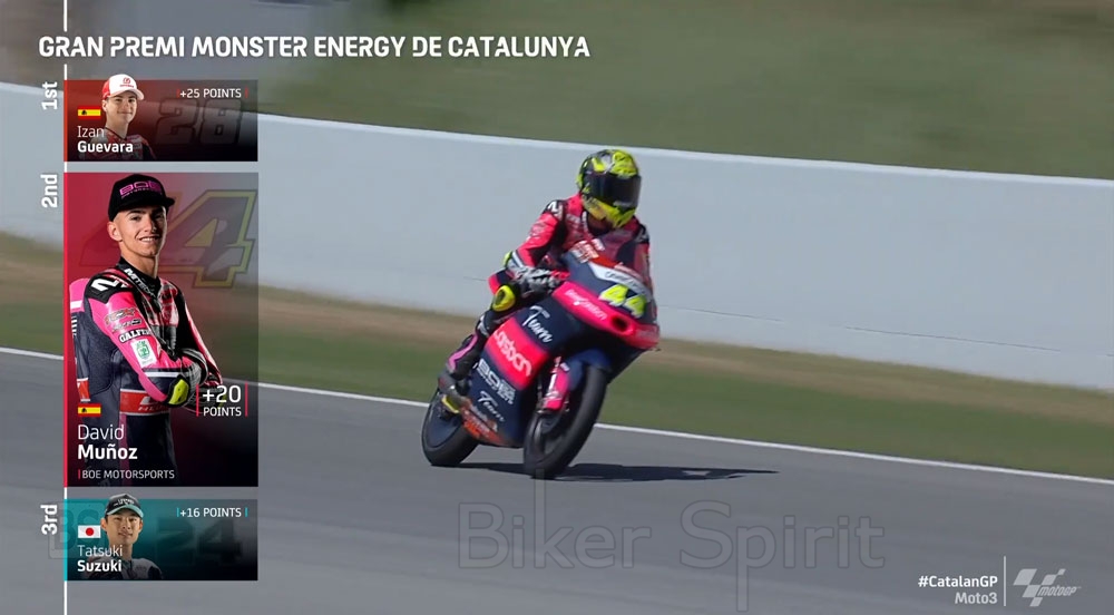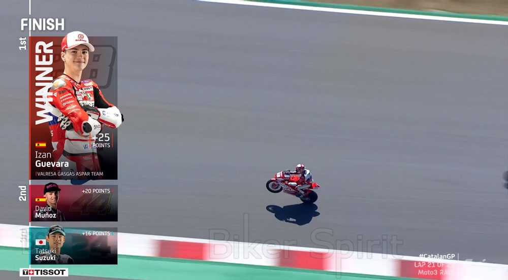 Ο αναβάτης της Team Aspar πέρασε τη γραμμή μπροστά από έναν εξαιρετικό David Muñoz, ο οποίος στον δεύτερο αγώνα του στο KTM της Team BOE κέρδισε το πρώτο του βάθρο, μπροστά από το Honda Leopard του Tatsuki Suzuki, που συμπλήρωσε το βάθρο του αγώνα!