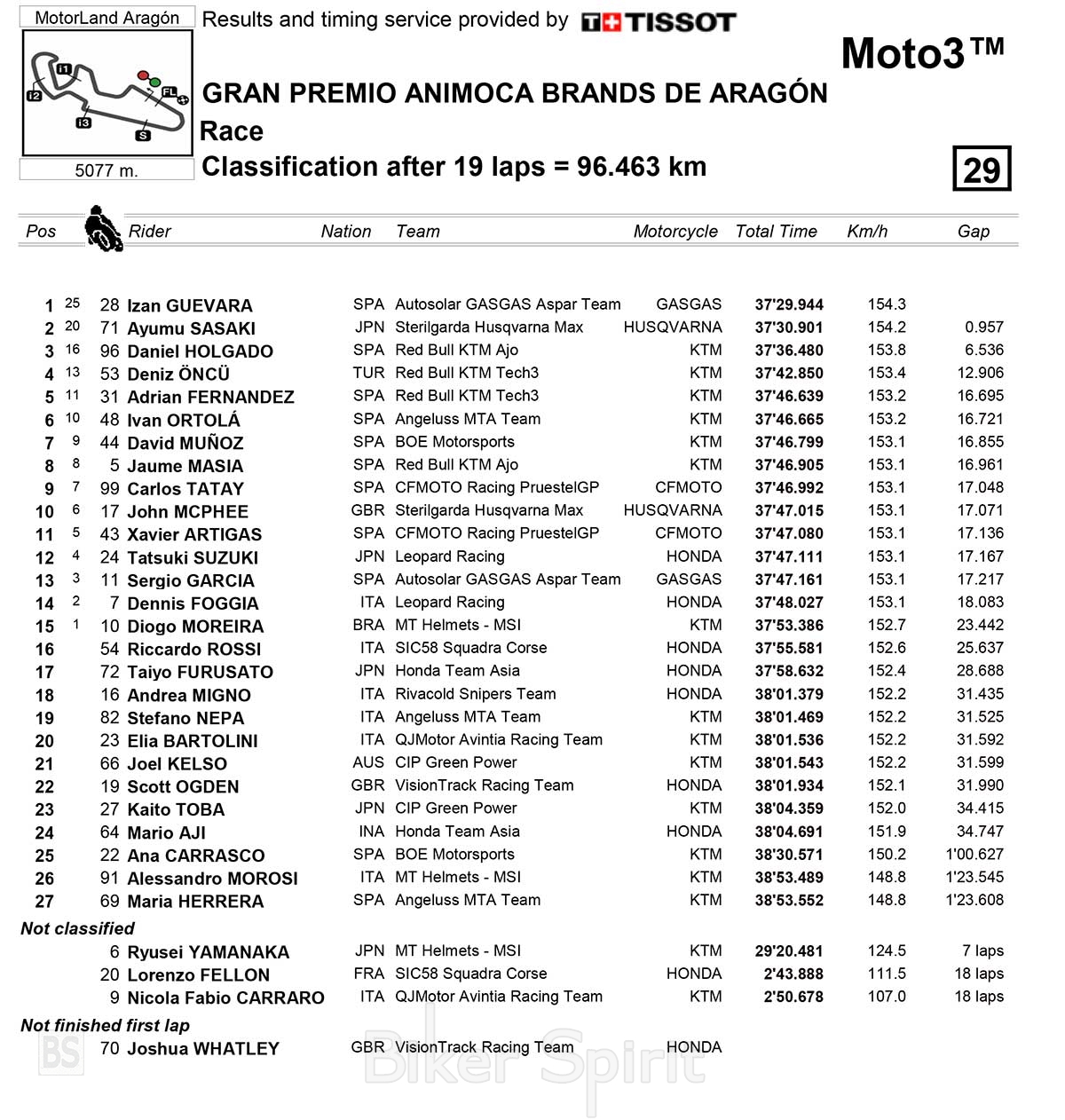 Από τις λίγες φορές που έχουμε δει τους πρώτους να ξεφεύγουν τόσο πολύ από όλη την υπόλοιπη ομάδα οδηγών ήταν σήμερα, με τον poleman, Izan Guevara (GasGas Aspar) που μπήκε μπροστά από την αρχή και διατήρησε το προβάδισμα του αγώνα, μέχρι την καρό σημαία, κερδίζοντας τον Ayumu Sasaki (Husqvarna Max Racing Team) που τον πίεσε προς το τέλος του αγώνα και τον πρωτάρη Daniel Holgado, (KTM Red Ταύρος Ajo) που έκλεισε το βάθρο του Ισπανικού GP.