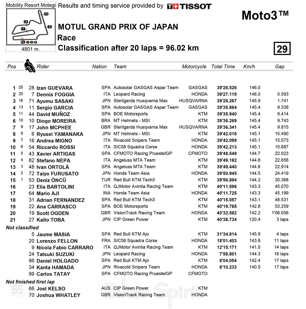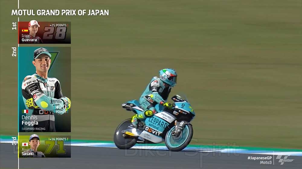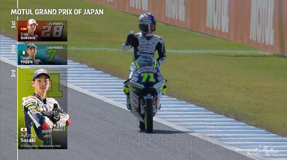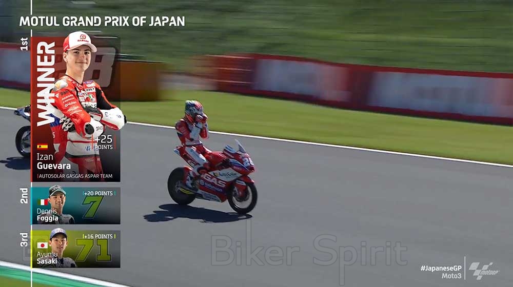 Για τον Guevara (που για πρώτη φορά αγωνίστηκε στο Motegi) αυτή είναι η πέμπτη νίκη της σεζόν, η δεύτερη συνεχόμενη μετά από αυτή του Aragon, μια νίκη που τον κάνει να επεκτείνει την βαθμολογία του στο πρωτάθλημα στους +45 βαθμούς επί του ομόστυαλού του του Sergio Garcia, που σήμερα τερμάτισε τέταρτος.