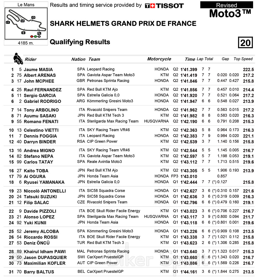 Ο Jaume Masia κερδίζει τον πόλο του Grand Prix του Le Mans, για τον δέκατο γύρο του παγκόσμιου πρωταθλήματος Moto3.
