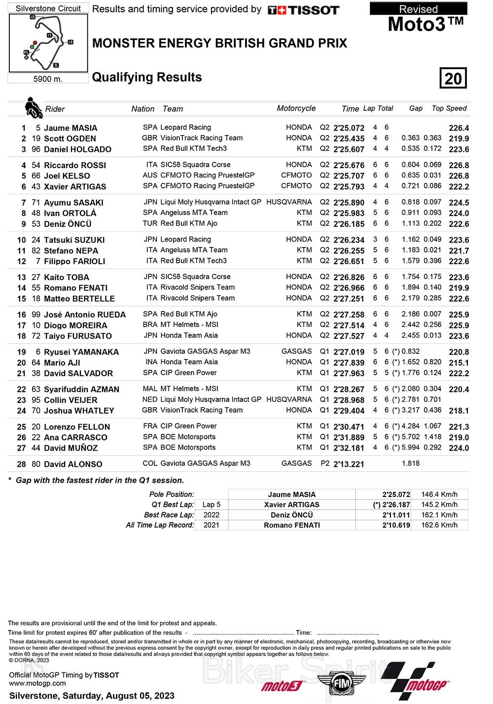Ο Jaume Masia κατέκτησε την pole position του βρετανικού Grand Prix της κατηγορίας Moto3, του ένατου γύρου του Παγκοσμίου Πρωταθλήματος 2023 στο Silverstone.