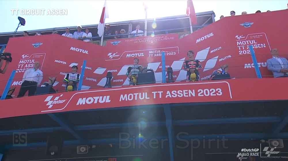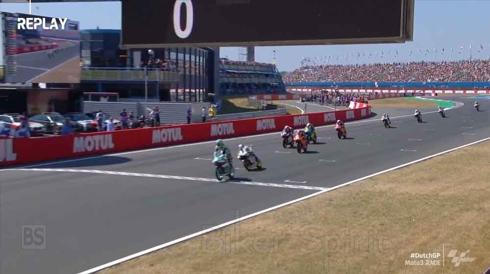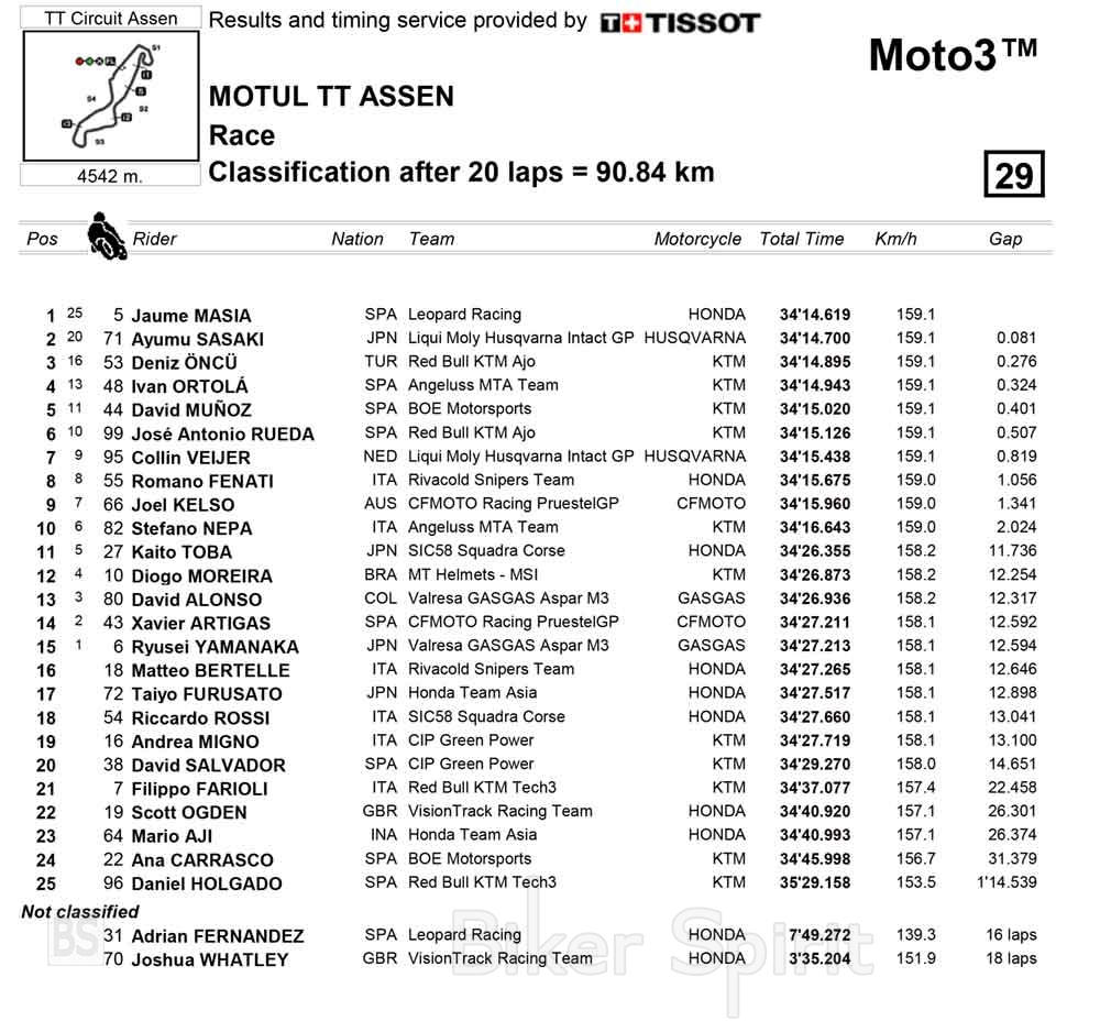 Ήταν 28 βαθμοί στον αέρα και 38 στην άσφαλτο, κάτω από έναν ουρανό χωρίς σύννεφα και ηλιόλουστο και σε έναν συναρπαστικό αγώνα με έως και 14 αναβάτες να παλεύουν και να ανταλλάσσουν θέσεις για την νίκη, μια ομάδα που στη συνέχεια μειώθηκε σε 10 αναβάτες, φτάνοντας στο τελευταίο γύρο να καθορίζει την νίκη το τελευταίο chicane, με τον Ιάπωνα Ayumu Sasaki, να χάνει την πρώτη θέση από τον Masiá και να τερματίζει δεύτερος, μπροστά από τον νικητή του Sachsenring, Deniz Oncu, που έκλεισε το βάθρο του Assen.