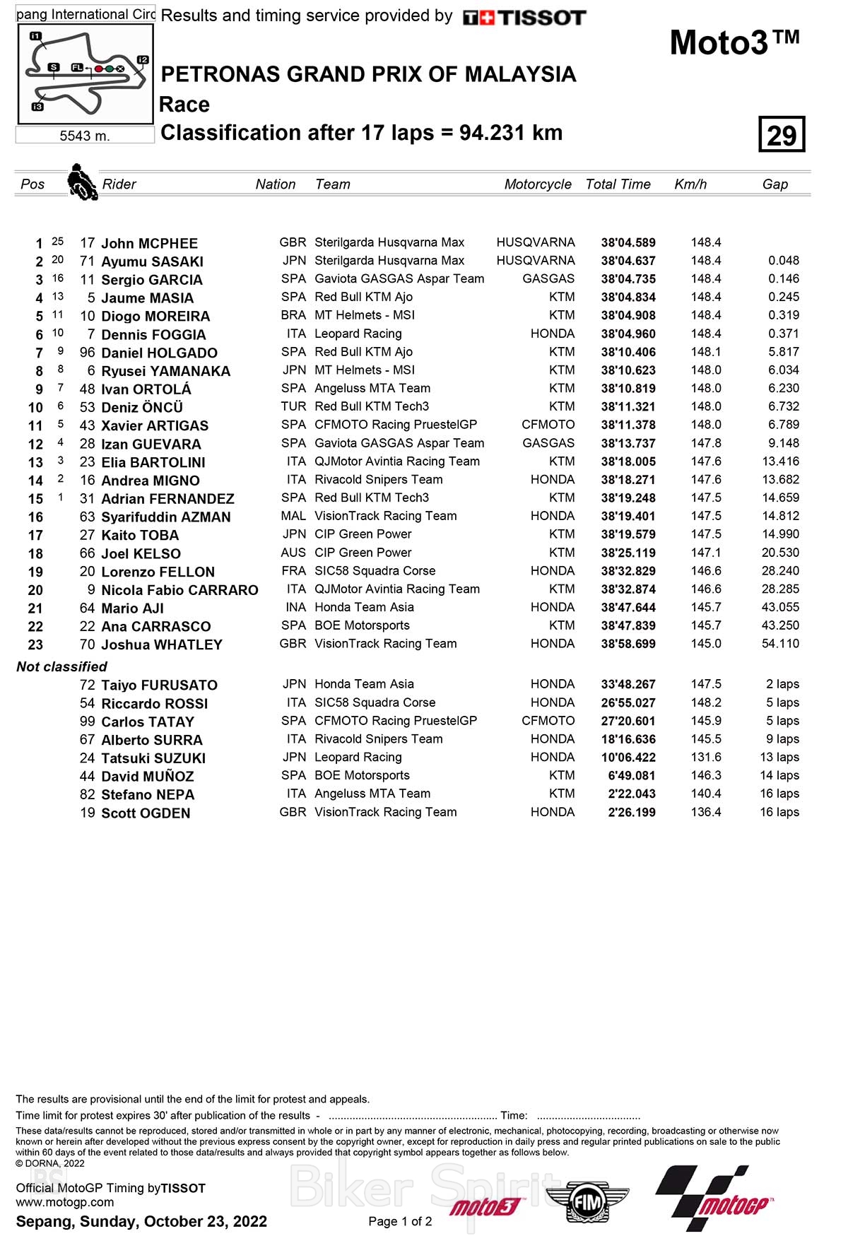 Ο John McPhee κέρδισε το Grand Prix της Μαλαισίας στην κατηγορία Moto3, για τον 19ο και τον προτελευταίο γύρο του Παγκοσμίου Πρωταθλήματος 2022.