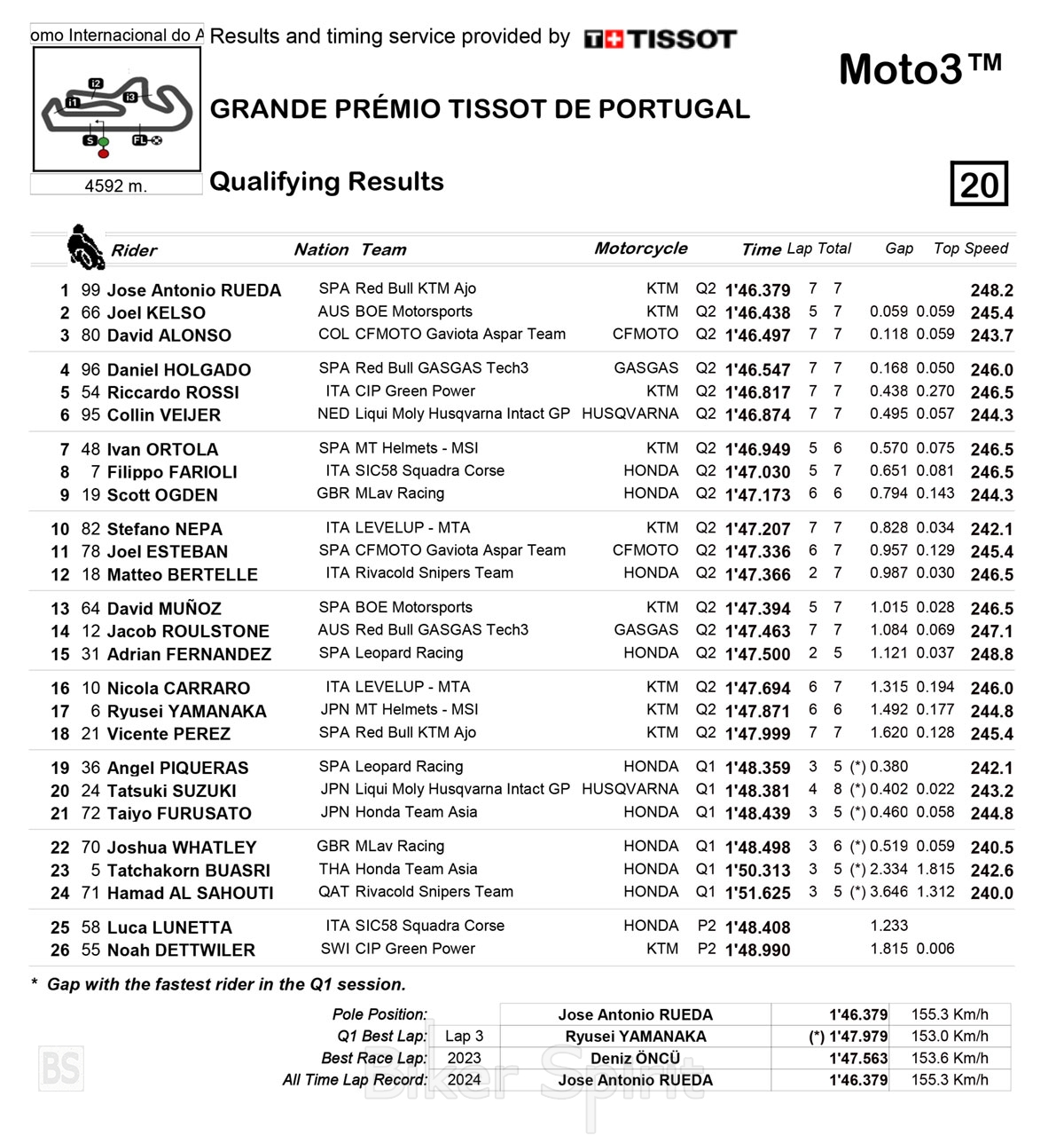 Ο αναβάτης της Team KTM Red Bull Ajo έκανε τη διαφορά στο T4, όπου στον «καλό» γύρο κέρδισε τρία δέκατα έναντι του κοντινότερου αντιπάλου του, Joel Kelso της Team BOE Motorsports, κλείνοντας με περιθώριο 59 χιλιοστών. Επίσης στην πρώτη σειρά είναι ο νικητής του Κατάρ Ντέιβιντ Αλόνσο με το CFMoto της Team Aspar.