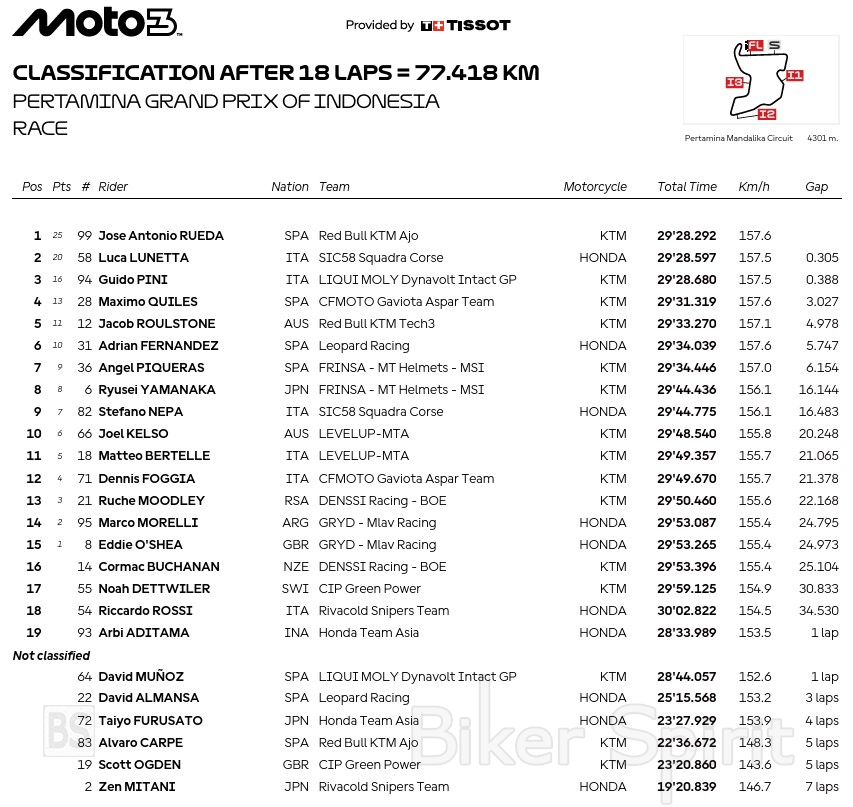 Μετά την παρέμβαση της Διεύθυνσης Αγώνα, τα πράγματα ανατράπηκαν. Ο Adrian Fernandez τιμωρήθηκε για την επαφή του με τον Muñoz, ενώ ο Quiles πήρε διπλό Long Lap penalty που δεν πρόλαβε να εκτίσει. Έτσι, ο Jose Antonio Rueda ανακηρύχθηκε και νικητής του Grand Prix της Ινδονησίας, κατακτώντας τη δέκατη νίκη του μέσα στη σεζόν!