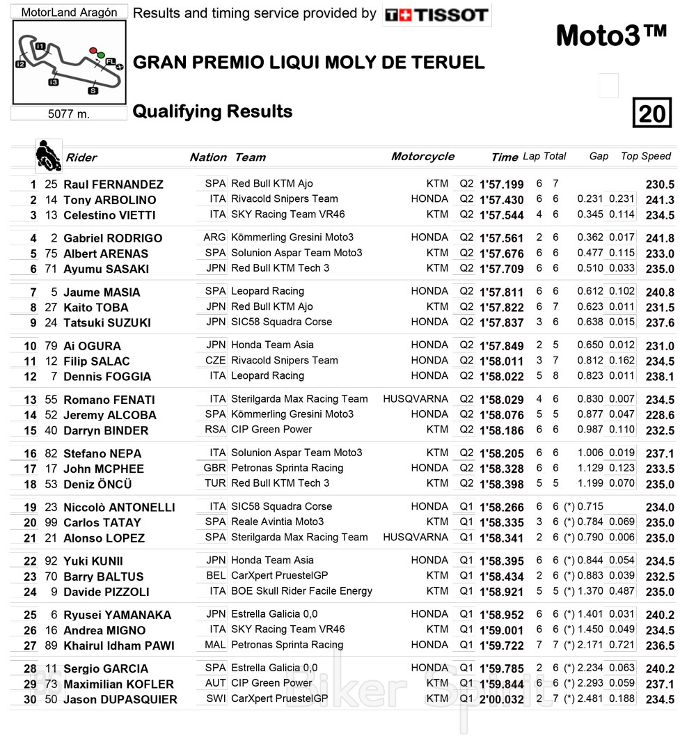 Ο οδηγός της ομάδας KTM Ajo έγραψε χρόνο 1:57.199, κατακτώντας την πέμπτη pole position της σεζόν και θα εκκινήσει μπροστά από τους Tony Arbolino (Snipers) και Celestino Vietti (Sky Racing Team VR46).