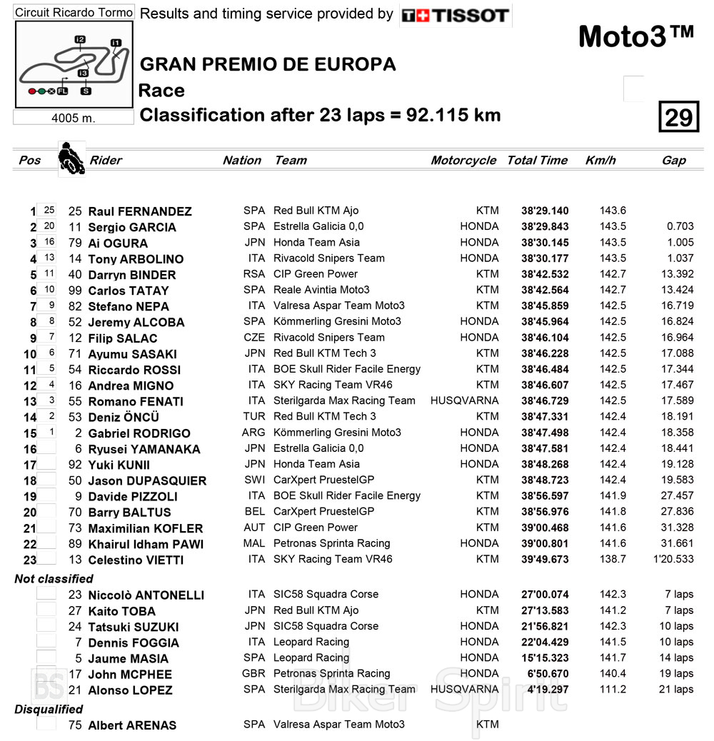 Σε στεγνή πίστα και μια θερμοκρασία 18ºC έδωσαν τον αγώνα τους οι αναβάτες της Moto3 στην Valencia σήμερα.
