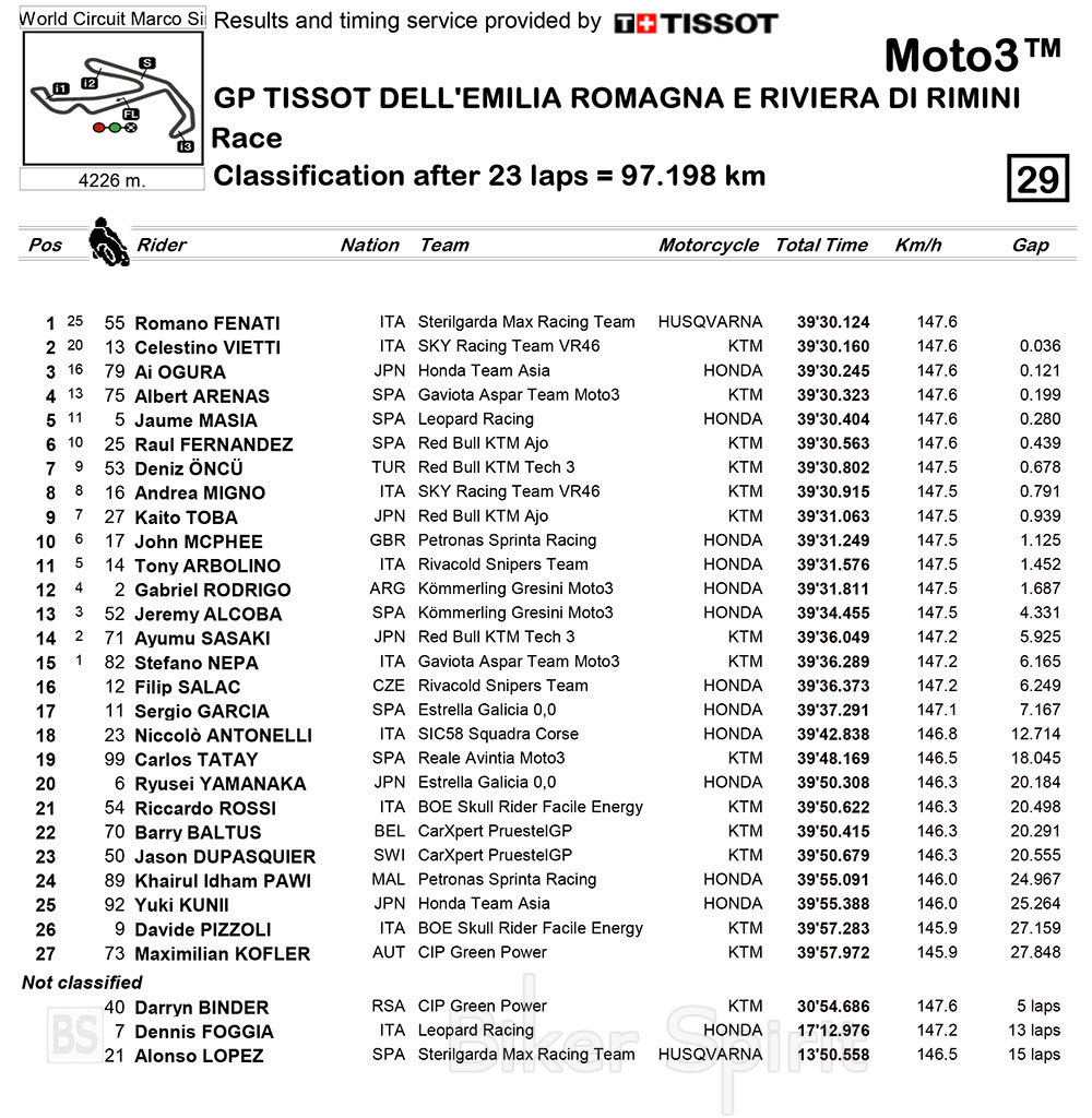 Ο Deniz Öncü τερμάτισε στην έβδομη θέση μπροστά από τον Andrea Migno (Sky Racing Team VR46) και τον Kaito Toba. Ο John McPhee (Petronas) ολοκληρώνει τους πρώτους δέκα.