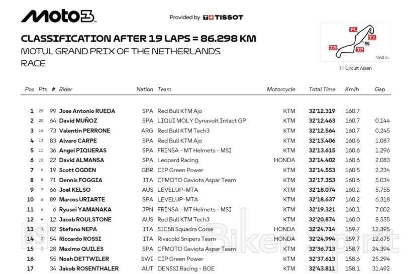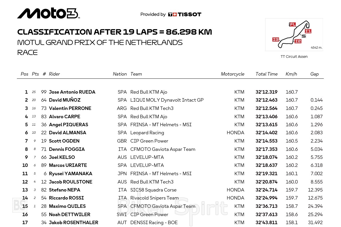 Moto3: Ο Rueda νίκησε στο Assen σε έναν αγώνα που τελείωσε με κόκκινη σημαία μία στροφή πριν το τέλος – Aποτελέσματα