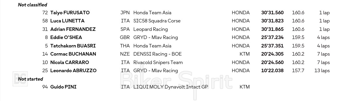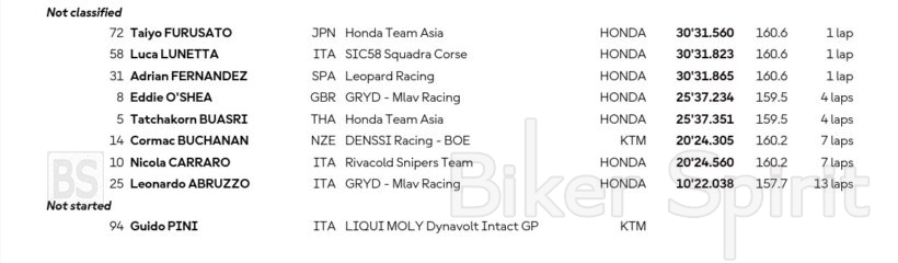 Ο Maximo Quiles, που είχε νικήσει στον προηγούμενο αγώνα στο Mugello και ηγούνταν του αγώνα σε πολλά σημεία, έπεσε στην K10 τρεις γύρoυς πριν το τέλος. Ήταν το πρώτο του “μηδέν” στη φετινή σεζόν και ήρθε τη στιγμή που ο Rueda ανέβαινε πάλι στην κορυφή.