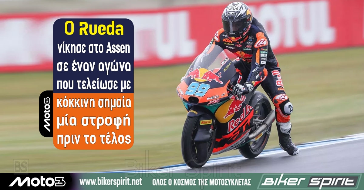 Ο Jose Antonio Rueda πήρε την νίκη στο Assen, σε έναν αγώνα της Moto3 που διακόπηκε με κόκκινη σημαία μόλις μία στροφή πριν την καρό σημαία, έπειτα από σοβαρή πολλαπλή πτώση στην τελευταία στροφή του προτελευταίου γύρου.