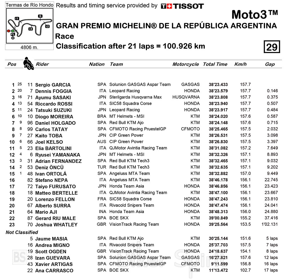 Οι τελευταίοι γύροι είναι συγκλονιστικοί με τον Sergio Garcia να κερδίζει στο σπριντ με έναν εξαιρετικό Dennis Foggia (Leopard) και έναν Ayumu Sasaki που αναρρώνει (Max Racing Team) να κλείνουν το βάθρο στην Αργεντινή, που καθορίστηκε στην κυριολεξία στις τελευταίες στροφές του αγώνα!