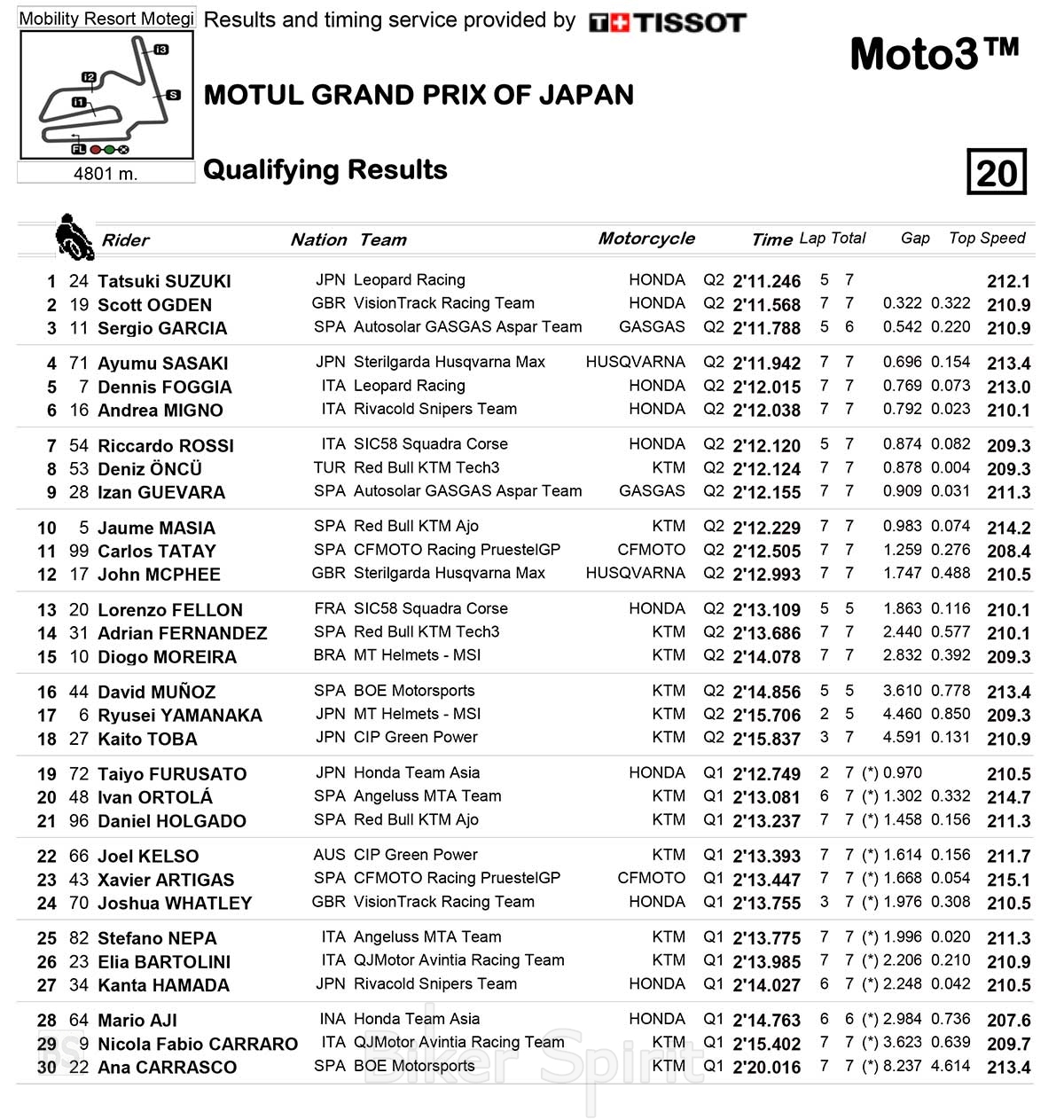Στην πρώτη σειρά με τον Ιάπωνα αναβάτη θα είναι ο Scott Ogden με τη Honda της Team VisionTrack και ο Sergio Garcia στο GasGas της Team Aspar, και οι δύο πέρασαν από το Q1.
