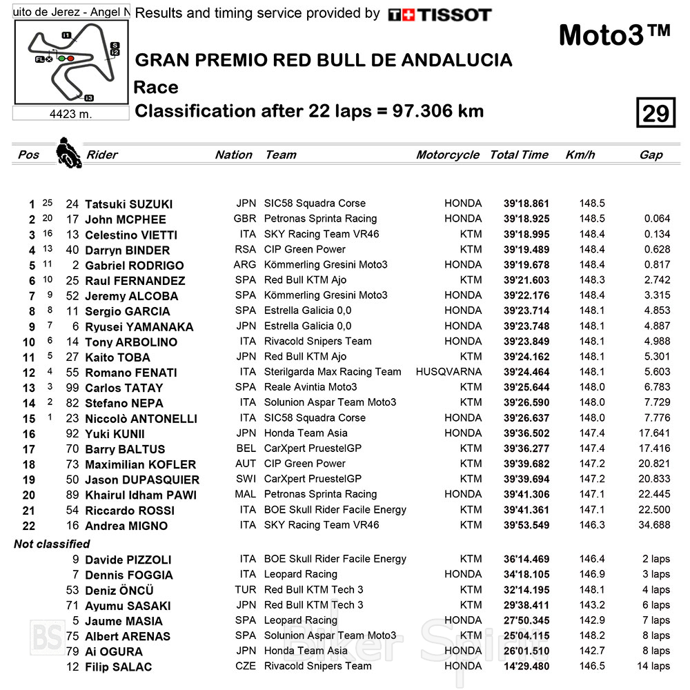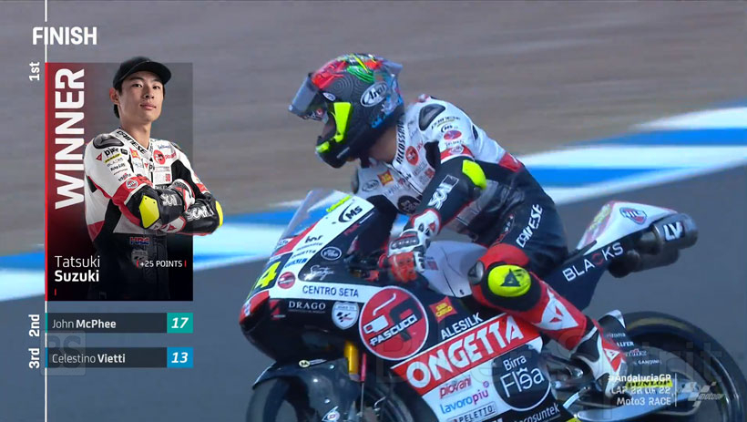 Σε έναν θεαματικό αγώνα της μικρής κατηγορίας που βλέπουμε πάντα απίστευτες μάχες, ήταν ο Ιάπωνας Tatsuki Suzuki που κατάφερε αυτή την φορά και μετουσίωσε την pole position σε νίκη στο GP της Ανδαλουσίας, για τον 3ο αγώνα της χρονιάς!
