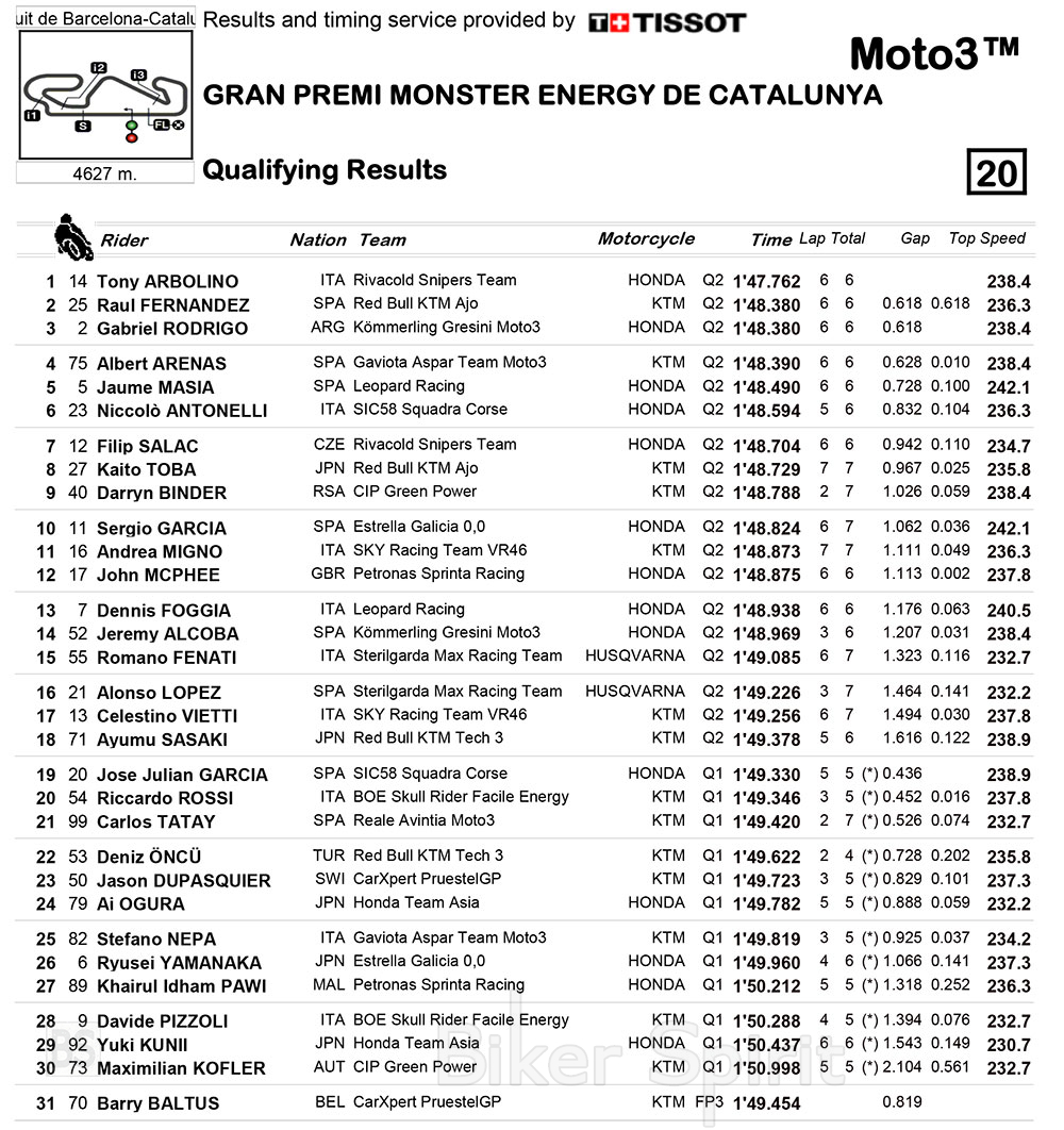 Από την 7η θέση θα ξεκινήσει ο Filip Salac που προηγείται του Kaito Toba και του Darryn Binder. Ο Sergio Garcia ολοκληρώνει την πρώτη δεκάδα
