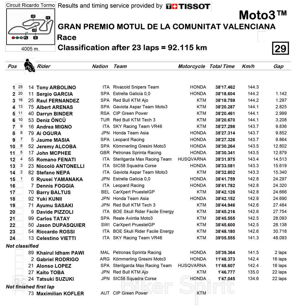 Αυτά τα αποτελέσματα αφήνουν τον τίτλο της Moto3 στον αέρα και θα είναι το Portimao που θα αποφασίσει τον φετινό πρωταθλητή. Ο Albert Arenas διατηρεί το προβάδισμα με 170 βαθμούς, οκτώ περισσότερους από τον Ai Ogura (2ος 162.) και διαφορά μόνο 11 βαθμών έναντι του Tony Arbolino (3ος 159.), ο οποίος με τη νίκη του σήμερα μπήκε στο παιχνίδι για τον τίτλο της Moto3.
