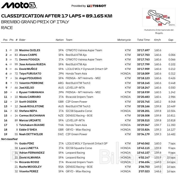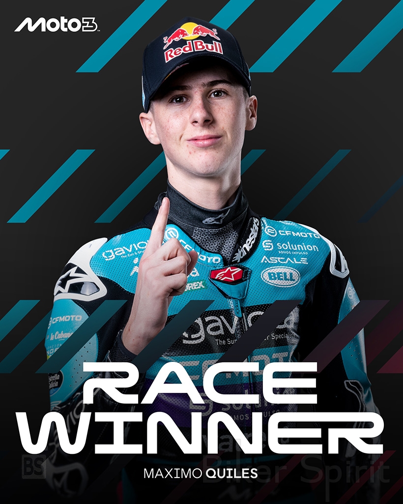 Ο Quiles έκανε την αποφασιστική του κίνηση στην τελευταία ευθεία, πέρασε μπροστά και κράτησε την πρώτη θέση με απειροελάχιστη διαφορά, 0.006 δευτερόλεπτα, από τον Carpe, πανηγυρίζοντας την πρώτη του νίκη στο Παγκόσμιο Πρωτάθλημα με τα χρώματα της CFMoto Aspar Team!