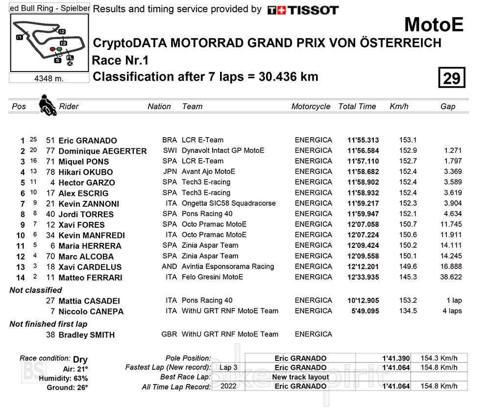 Ο Matteo Ferrari (Felo Gresini MotoE™) έπεσε στην έξοδο της στροφής 1 στην εκκίνηση του αγώνα, ευτυχώς χωρίς τραυματισμό, ενώ πτώση είχε και ο Bradley Smith (GRT RNF MotoE™) στο σικέην στον πρώτο γύρο.