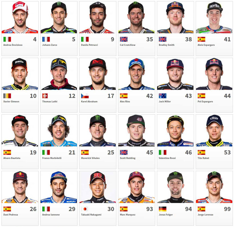 Οι οδηγοί από την Ισπανία είναι οι περισσότεροι με εννέα οδηγούς, τους Márquez, Lorenzo, Pedrosa, Viñales, Pol Espargaró, Aleix Espargaró, Bautista, Rins, και Rabat, ενώ ακλουθούν οι Ιταλοί με πέντε οδηγούς, τους Rossi, Dovizioso, Petrucci, Iannone, και Morbidelli, των οποίων η μέση ηλικία έχει μειωθεί φέτος με τον ερχομό του Franco Morbidelli. Οι Βρετανοί βρίσκονται στην τρίτη θέση με τρεις οδηγούς, τους Crutchlow , Redding και Smith. Οι υπόλοιποι επτά οδηγοί είναι από επτά διαφορετικές χώρες, όπως το Βέλγιο με τον Simeon, Ελβετία με τον Lüthi, Ιαπωνία με τον Nakagami, Γαλλία με τον Zarco, Αυστραλία με τον Miller, Γερμανία με τον Folger και Τσεχία με τον Abraham .