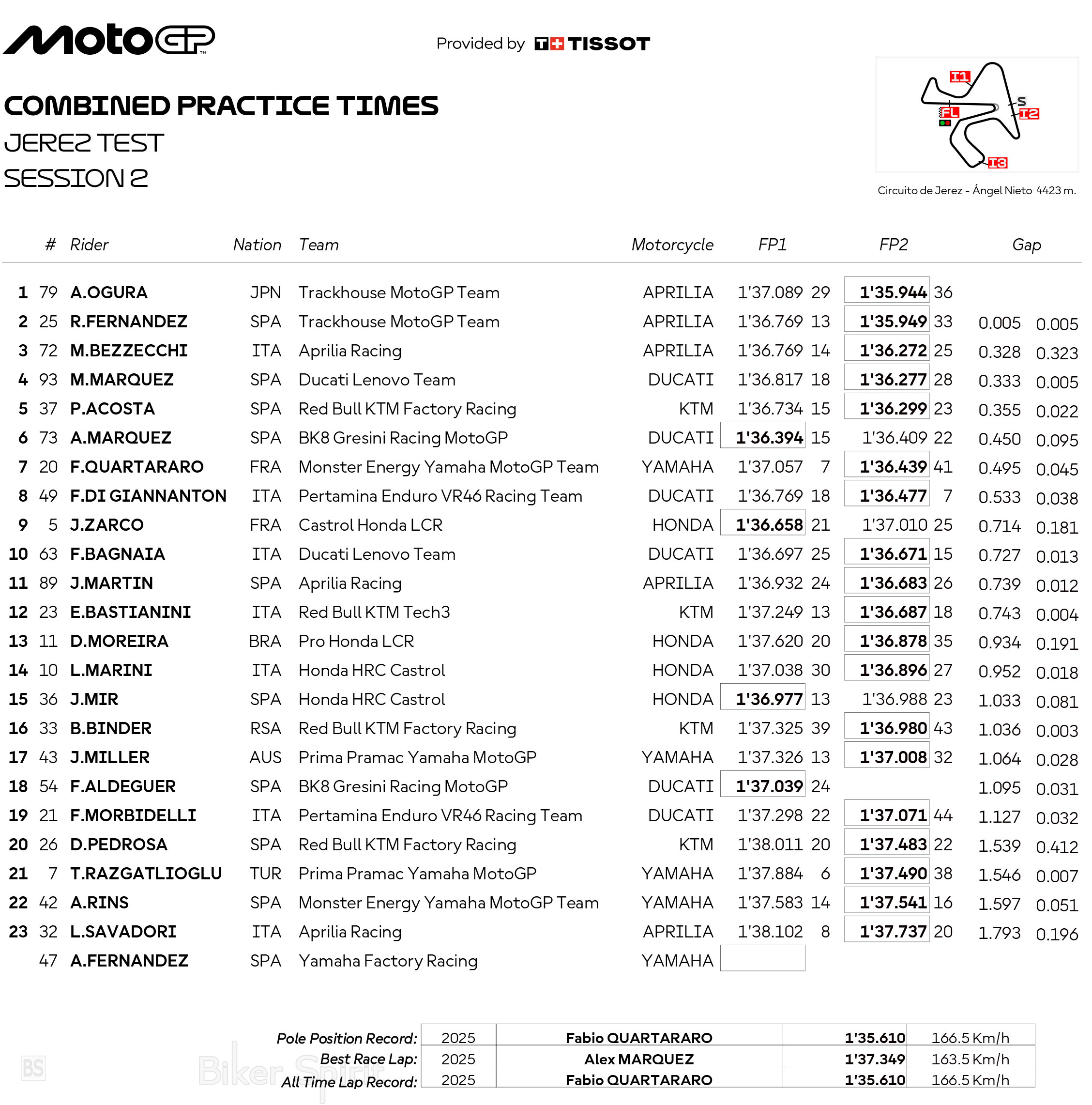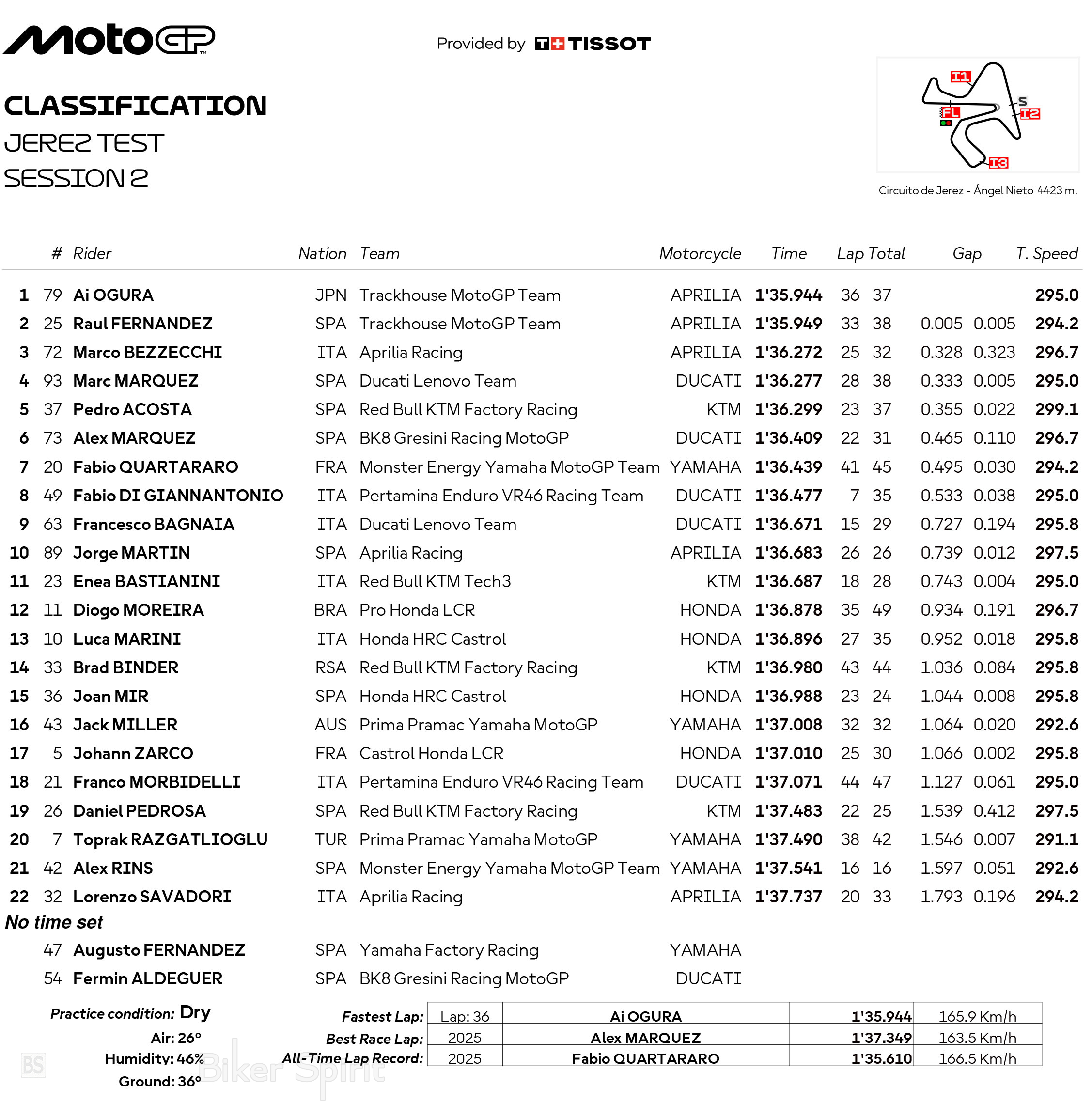 Στην κορυφή της ημέρας βρέθηκε ο Ai Ogura με 1:35.944, περνώντας στην πρώτη θέση στο τέλος και εξασφαλίζοντας το 1-2 για την Trackhouse. Ο Raul Fernandez ολοκλήρωσε δεύτερος, μόλις 0.005 δευτερόλεπτα πίσω, με τους δύο αναβάτες να δείχνουν σημαντική πρόοδο στο one-lap pace, που ήταν βασικός στόχος της ημέρας.