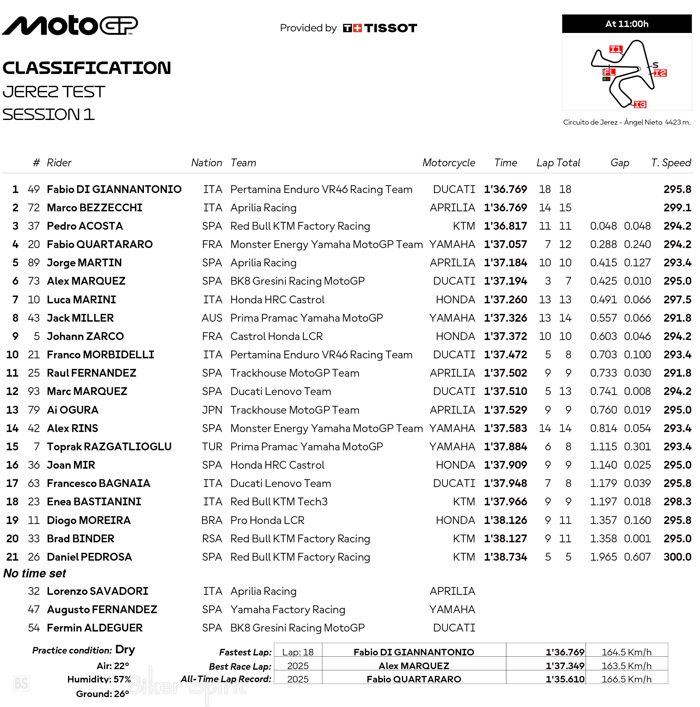 Στο πρωινό σκέλος του FP1 για το τεστ, ταχύτερος ήταν ο Di Giannantonio με 1:36.769, μπροστά από Bezzecchi και Acosta, ενώ στο απογευματινό Session οι χρόνοι έπεσαν στο 1:35, με τον Ogura να παίρνει την κορυφή στο τέλος. Η συνδυαστική κατάταξη επιβεβαίωσε την κυριαρχία της Aprilia, με τρεις μοτοσυκλέτες της μάρκας στην πρώτη τριάδα.