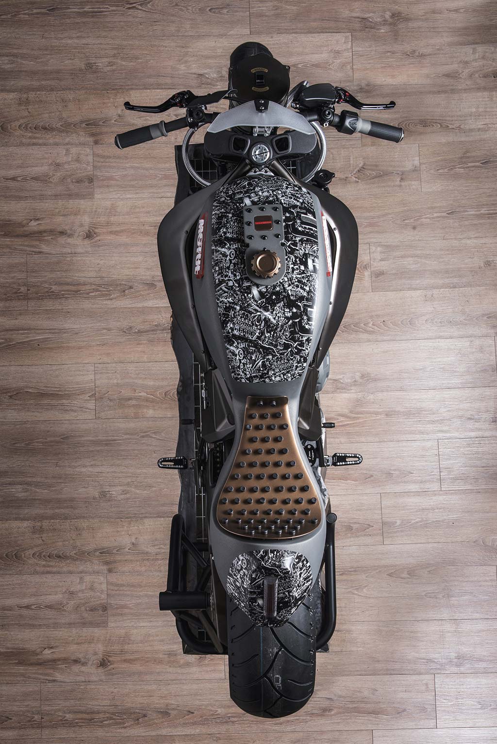 Ομοίως, η δεξαμενή καυσίμων που είναι χειροποίητη αλουμινίου, με το σήμα της εταιρίας των λιπαντικών, ενώ το βάψιμο είναι ιδιαίτερα εμπνευσμένο όπως και τα γραφικά που αναπαριστούν βιομηχανικά τμήματα όπως γρανάζια άξονες σωλήνες κι άλλα.