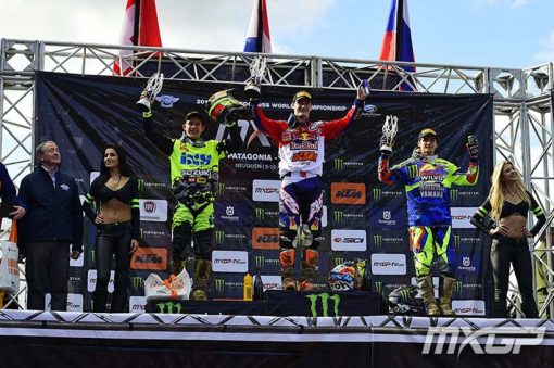 MXGP Overall Top Ten: 1. Tim Gajser (SLO, HON), 45 points; 2. Antonio Cairoli (ITA, KTM), 44 p.; 3. Maximilian Nagl (GER, HUS), 41 p.; 4. Romain Febvre (FRA, YAM), 35 p.; 5. Jeremy Van Horebeek (BEL, YAM), 34 p.; 6. Glenn Coldenhoff (NED, KTM), 27 p.; 7. Evgeny Bobryshev (RUS, HON), 27 p.; 8. Shaun Simpson (GBR, KTM), 25 p.; 9. Kevin Strijbos (BEL, SUZ), 24 p.; 10. Clement Desalle (BEL, KAW), 24 p.