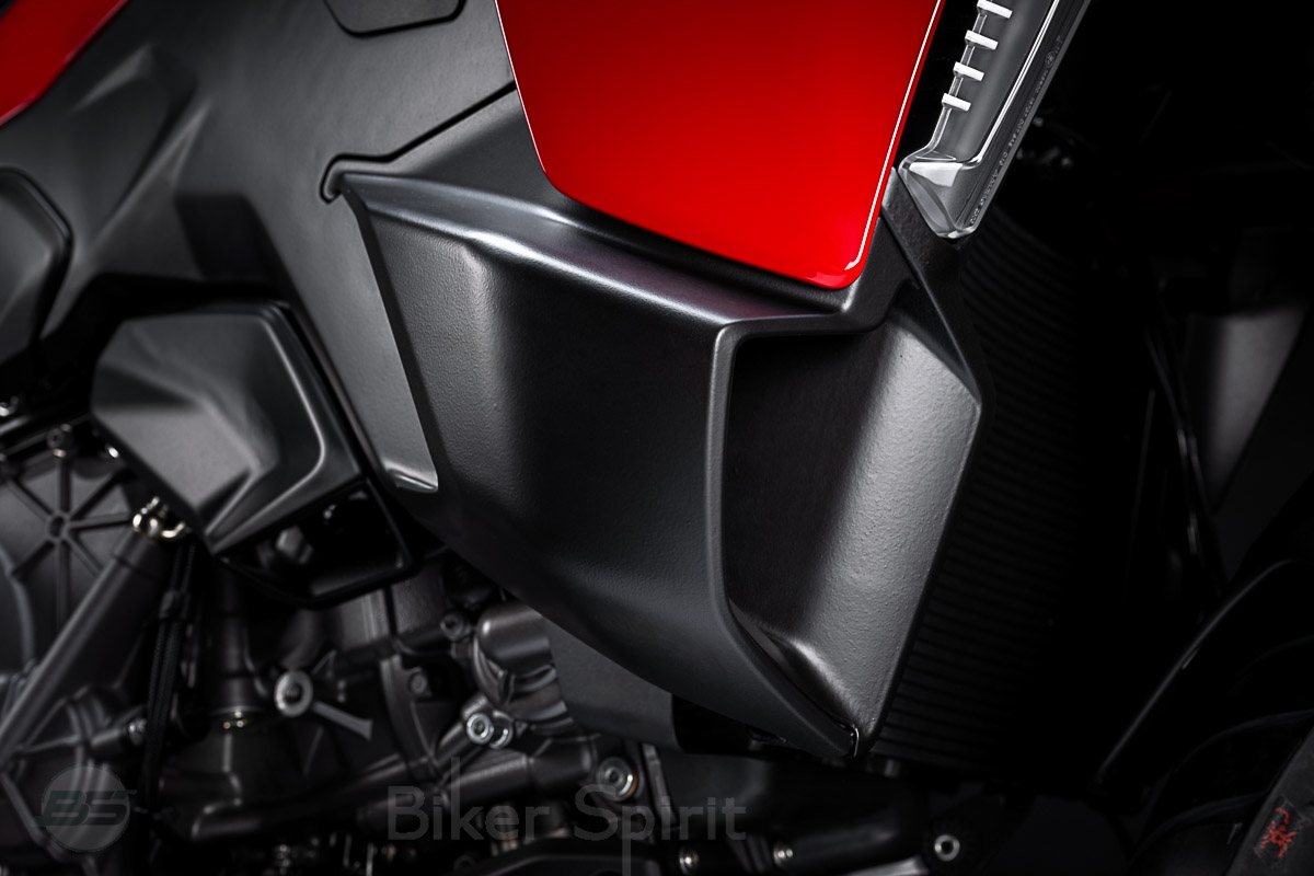 Για θερμική άνεση, όπως και στην Multistrada V4, έχουν εισαχθεί πλευρικοί μεταφορείς αέρα, ενσωματωμένοι στο σχεδιασμό της μοτοσυκλέτας που βοηθούν στην κατεύθυνση του καθαρού αέρα στα πόδια του αναβάτη.