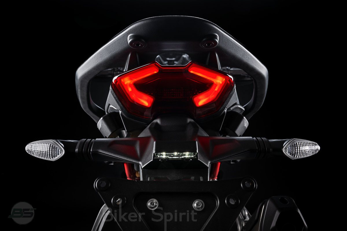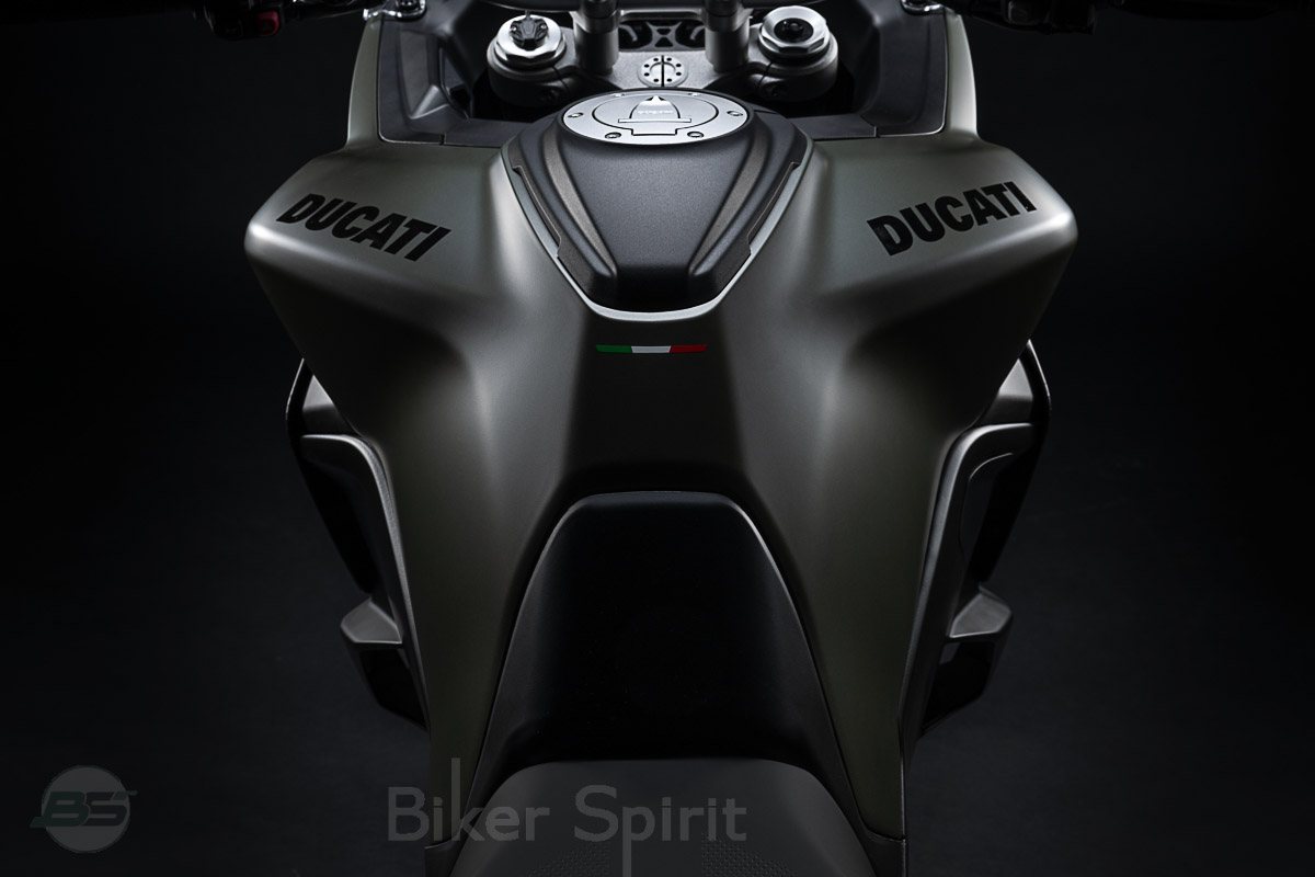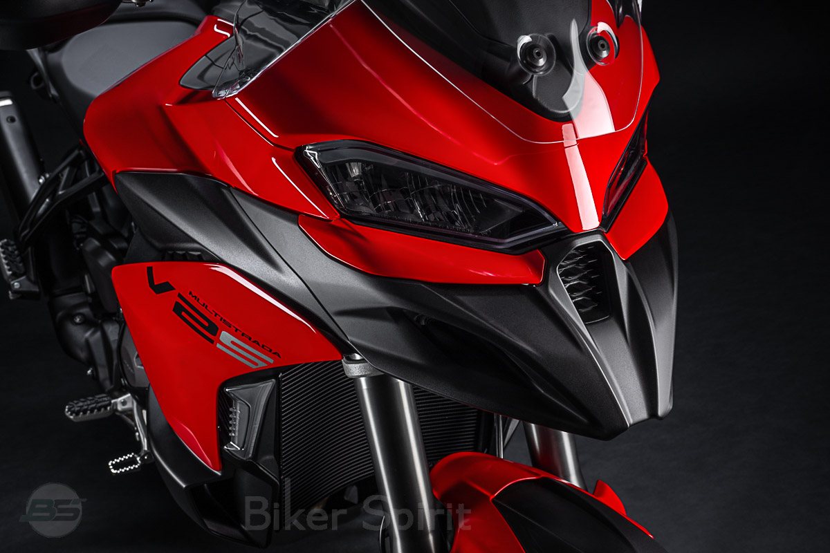 Οι νέοι προβολείς και το DRL εμπνευσμένα από την τελευταία γενιά Panigale και Multistrada V4 συμβάλλουν στη διαμόρφωση μιας συμπαγούς και επιθετικής μπροστινής όψης, άμεσα αναγνωρίσιμης. Το μικρότερο “ράμφος” είναι καλά ενσωματωμένο στο φέιρινγκ και δημιουργεί μια πιο αρμονική εικόνα. Τα φλας, λεπτά και εναρμονισμένα στο σχεδιασμό των πλευρικών πάνελ, έχουν επανασχεδιαστεί πλήρως και επανατοποθετηθεί για να προσφέρουν βέλτιστη ορατότητα και να δημιουργήσουν ένα κενό μεταξύ αυτών και του φέρινγκ που επιτρέπει τη διέλευση καθαρού αέρα προς τον αναβάτη.